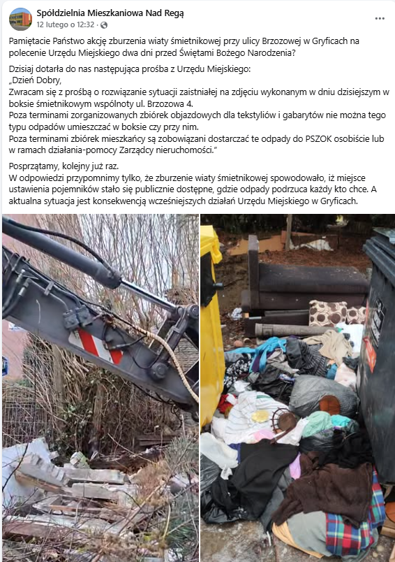 „Posprzątamy, kolejny już raz” – komentuje w mediach społecznościowych spółdzielnia. – „W odpowiedzi przypomnimy tylko, że zburzenie wiaty śmietnikowej spowodowało, iż miejsce ustawienia pojemników stało się publicznie dostępne, gdzie odpady podrzuca każdy kto chce. A aktualna sytuacja jest konsekwencją wcześniejszych działań Urzędu Miejskiego w Gryficach” – czytamy.