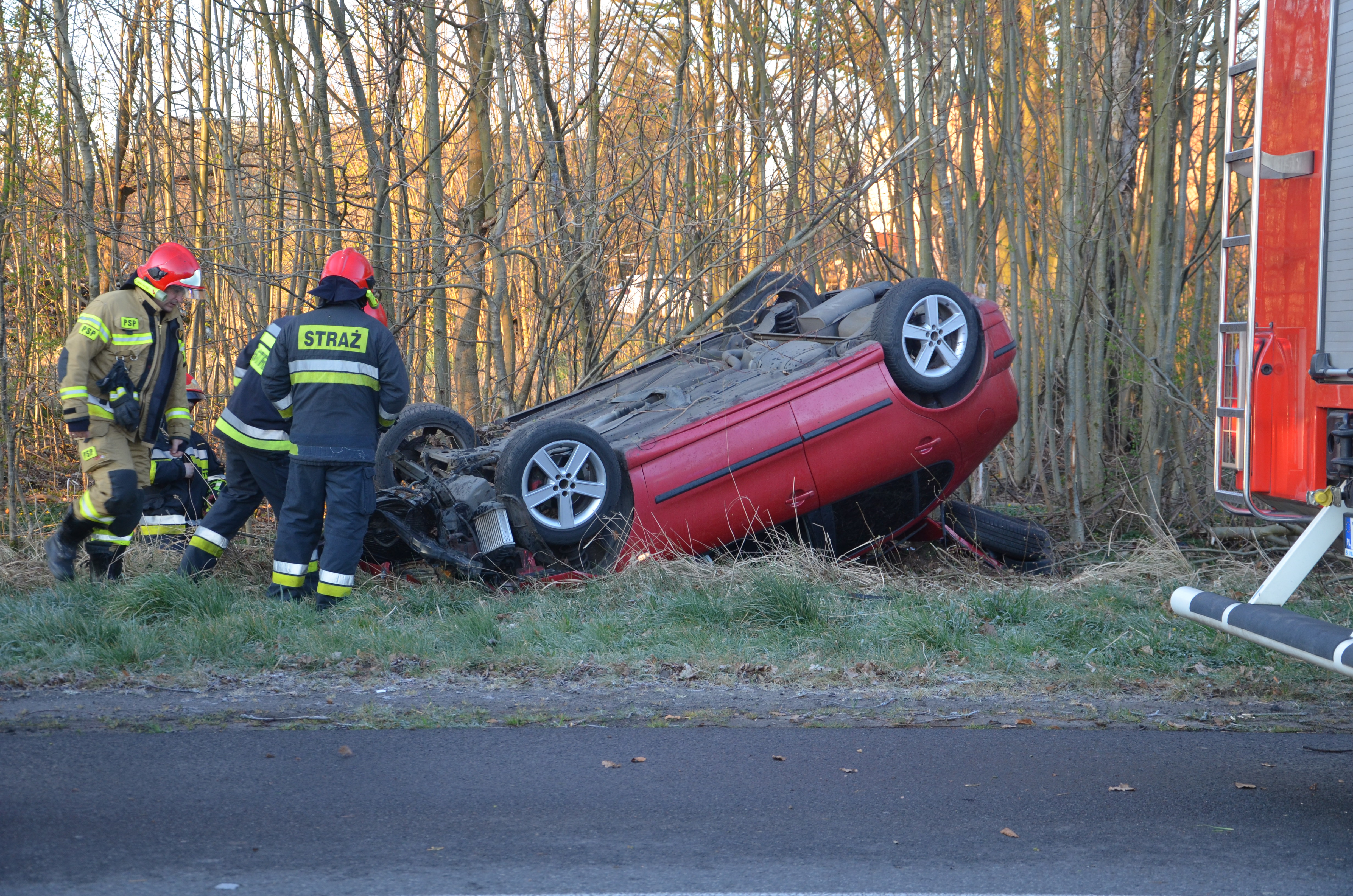 20-latek kierując osobowego Seata, stracił panowanie nad pojazdem, po czym zjechał z drogi na pobocze i dachował.