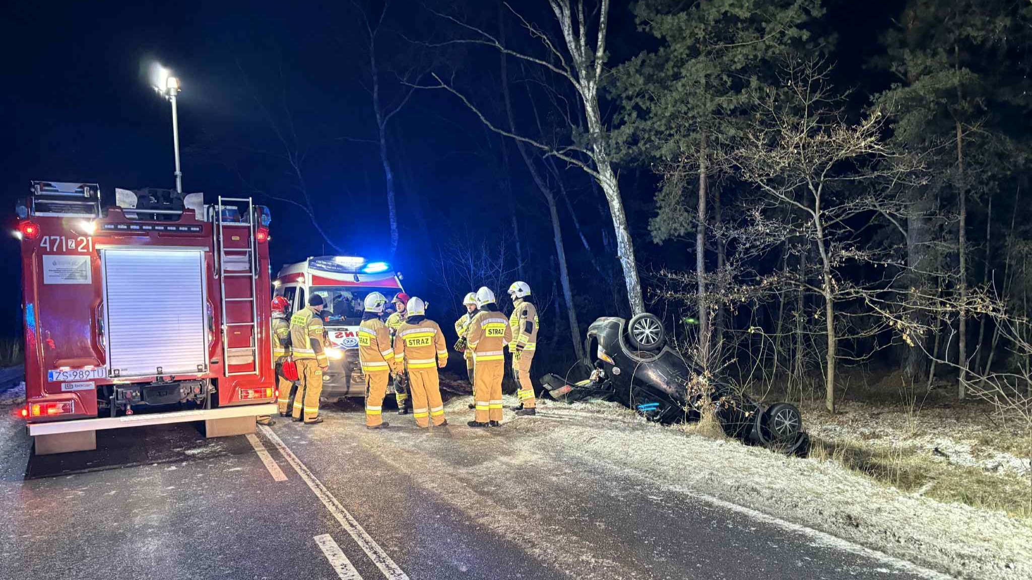 Do kolejnego groźnego zdarzenia na drodze doszło dziś wieczorem w okolicach Rogowa w gminie Trzebiatów. Samochód osobowy wypadł z trasy i dachował. Poszkodowany został młody mężczyzna.