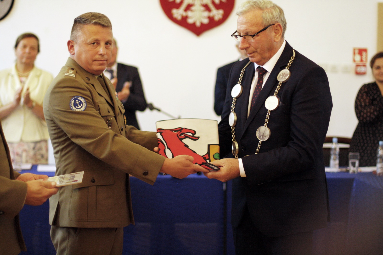 Radni Trzebiatowa, którzy debatowali w czasie nadzwyczajnej sesji musieli pochylić się nad dwoma wnioskami. Jeden z nich dotyczył nadania tytułu honorowego obywatela miasta Trzebiatów dla Marka Winiarskiego. Wniosek z taką propozycją wpłynął do Rady Miejskiej z inicjatywy Stowarzyszenia Żołnierzy Gminy Trzebiatów „Zawsze Wierni” oraz Grupy Rekonstrukcji Historycznej „Nałęcz”. - „W uznaniu zasług dla rozwoju wieloletniej i owocnej współpracy pomiędzy Gminami Trzebiatów i Brwinów, wnosimy o uhonorowanie Pana Marka Winiarskiego, godnością Honorowego Obywatela Miasta Trzebiatów. Pan Marek Winiarski w swej wieloletniej działalności samorządowej ogromną uwagę poświęcał wspólnej historii łączącej nasze miasta, szczególnie w kontekście historii naszej macierzystej Jednostki Wojskowej dziedziczącej zaszczytne tradycje Legii Akademickiej, która to w przeszłości tak silnie zaznaczyła swoją obecność na Ziemi Brwinowskiej. Jako Radny Gminy Brwinów był jednym z inicjatorów i wytrwałym orędownikiem nawiązania współpracy i bliskich relacji z trzebiatowską Jednostką Wojskową a następnie trzebiatowskim samorządem. Dzięki zaangażowaniu Pana Marka Winiarskiego, który od przeszło dwudziestu lat patronuje tym relacjom, nabrały one przyjacielskiego charakteru – czytamy we wzniosku. Pozytywną opinię w tek kwestii wydała również Kapituła Nadania Honorowego Obywatelstwa Miasta Trzebiatów. Druga uchwała dotyczyła nadania imienia jednej z alei w Mrzeżynie - Aleja Brwinowska. Była to propozycja burmistrza Trzebiatowa Józefa Domańskiego. Zarówno pierwszy jak i drugi wniosek Radni poparli jednogłośnie. Tuż przed zakończeniem obrad żołnierze z trzebiatowskiej jednostki, którzy przebywali na misji pokojowej w Iraku podarowali na ręce Józefa Domańskiego flagę z herbem Trzebiatowa, która wywieszona była w czasie pełnienia pokojowego kontyngentu.