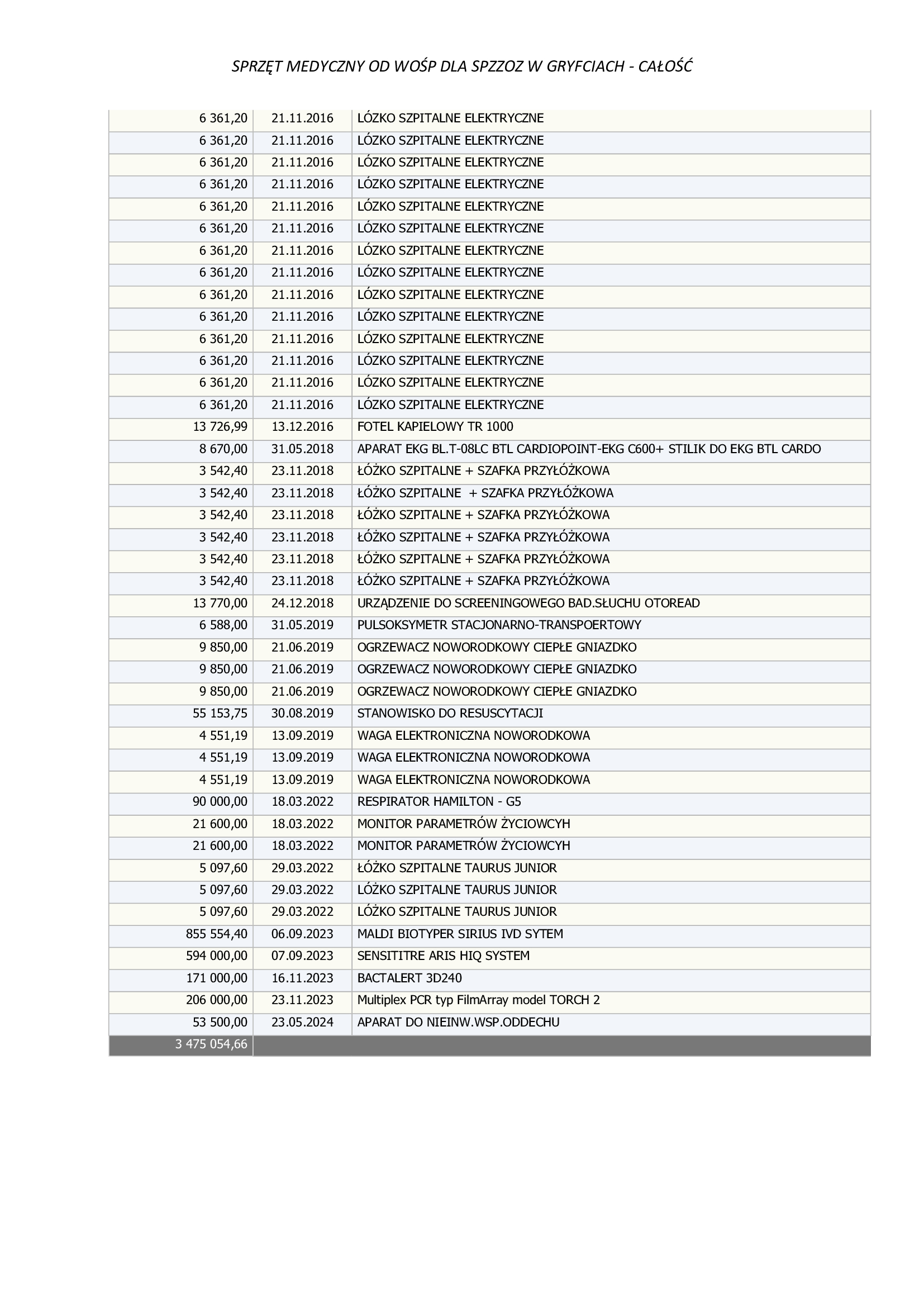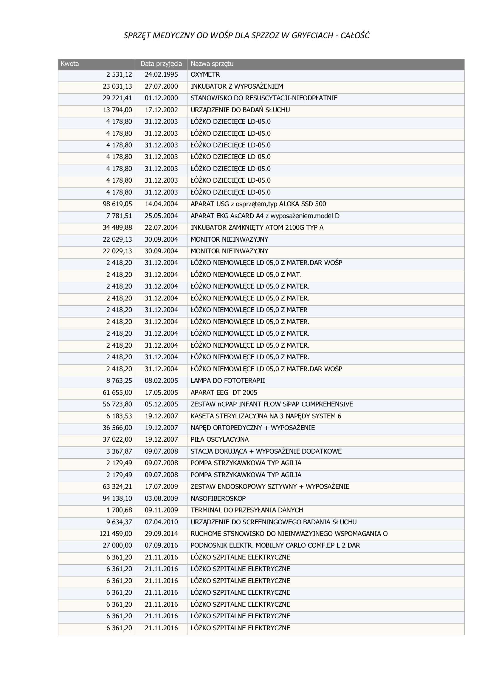 Lista zakupów robi wrażenie. Dzięki wsparciu WOŚP gryficki szpital został wyposażony m.in. w nowoczesne łóżka szpitalne (również elektryczne), sprzęt do resuscytacji, respiratory, monitory parametrów życiowych, aparaty EKG, pulsoksymetry, wagi noworodkowe, ogrzewacze dla noworodków, a także specjalistyczne urządzenia wykorzystywane w diagnostyce laboratoryjnej, takie jak systemy do identyfikacji drobnoustrojów, testy PCR czy zaawansowane analizatory. W ostatnich latach do placówki trafiły również aparaty wspierające leczenie pacjentów z niewydolnością oddechową.