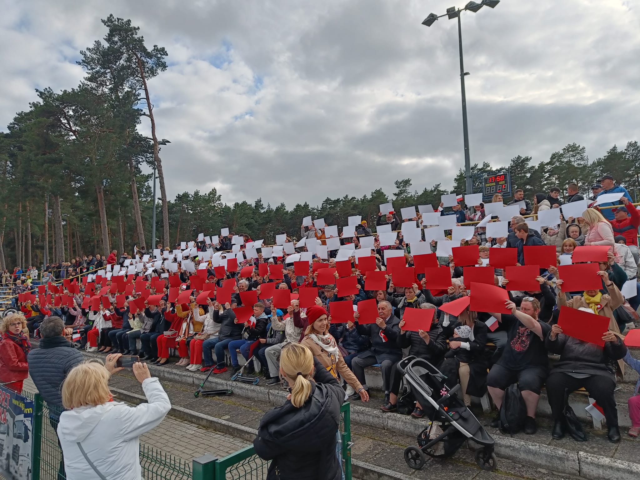 W ramach święta o godzinie 17 na placu rtm. W. Pileckiego nastąpiło uroczyste wciągnięcie flagi na maszt. Następnie korowód stworzony z orkiestr dętych Wood&Brass Band oraz zaprzyjaźnionych orkiestr z Płot i Drezdenka, Zespołu Pieśni i Tańca Ziemi Goleniowskiej Ina oraz mieszkańców Goleniowa i okolic przeszedł na stadion, niosąc olbrzymią stumetrową flagę. Tam o godz. 18 na trybunach utworzono żywą flagę narodową, a następnie odbył się koncert orkiestr dętych. Zobaczcie zdjęcia z tego święta...
