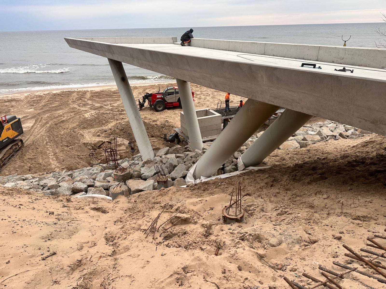 Powstaje także układ komunikacyjny – zarówno pionowy, jak i poziomy. W planach jest m.in. winda oraz pochylnia, które mają ułatwić dostęp do plaży osobom z ograniczoną mobilnością. Docelowo nowe zejście ma być w pełni dostępne i bezpieczne. Oprócz schodów i windy powstanie także taras widokowy oraz nowoczesna toaleta, która będzie funkcjonować przez cały rok.
