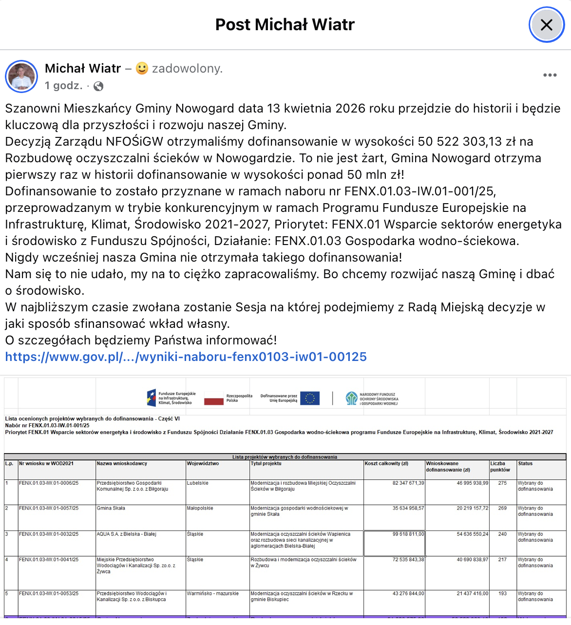 13 kwietnia 2026 roku może przejść do historii Gminy Nowogard. Jak poinformował burmistrz Michał Wiatr, samorząd otrzymał ponad 50 milionów złotych dofinansowania na rozbudowę miejskiej oczyszczalni ścieków. To największe wsparcie finansowe, jakie kiedykolwiek trafiło do gminy.