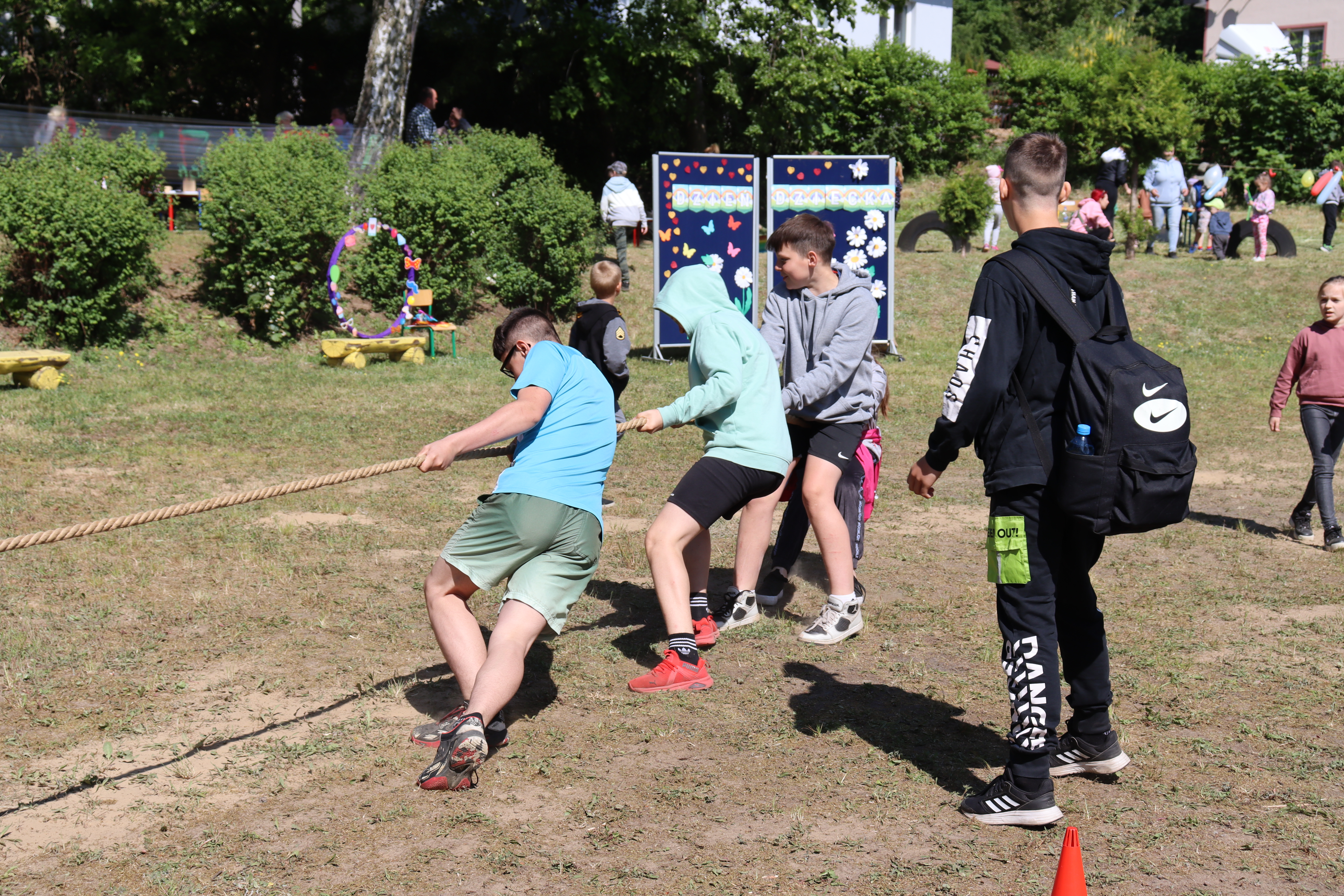 Ten radosny dzień obfitował w różne atrakcje, a boisko szkolne w Wyszoborze stało się miejscem wspaniałej imprezy! Dla dzieci przygotowano liczne konkursy, gry, zabawy i konkurencje sportowe. Wśród nich największą popularnością cieszyło się przeciąganie liny, puszczanie baniek mydlanych, malowanie na folii i papierze oraz kolorowanie kamieni. Nie zabrakło też tradycyjnego malowania twarzy.