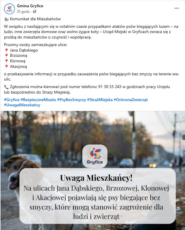 Urząd Miejski w Gryficach apeluje do właścicieli czworonogów o odpowiedzialność i wyprowadzanie psów na smyczy. Osoby, które zauważą psy biegające luzem w wymienionych rejonach, proszone są o kontakt pod numerem 91 38 53 243 w godzinach pracy urzędu lub bezpośrednio ze strażą miejską.