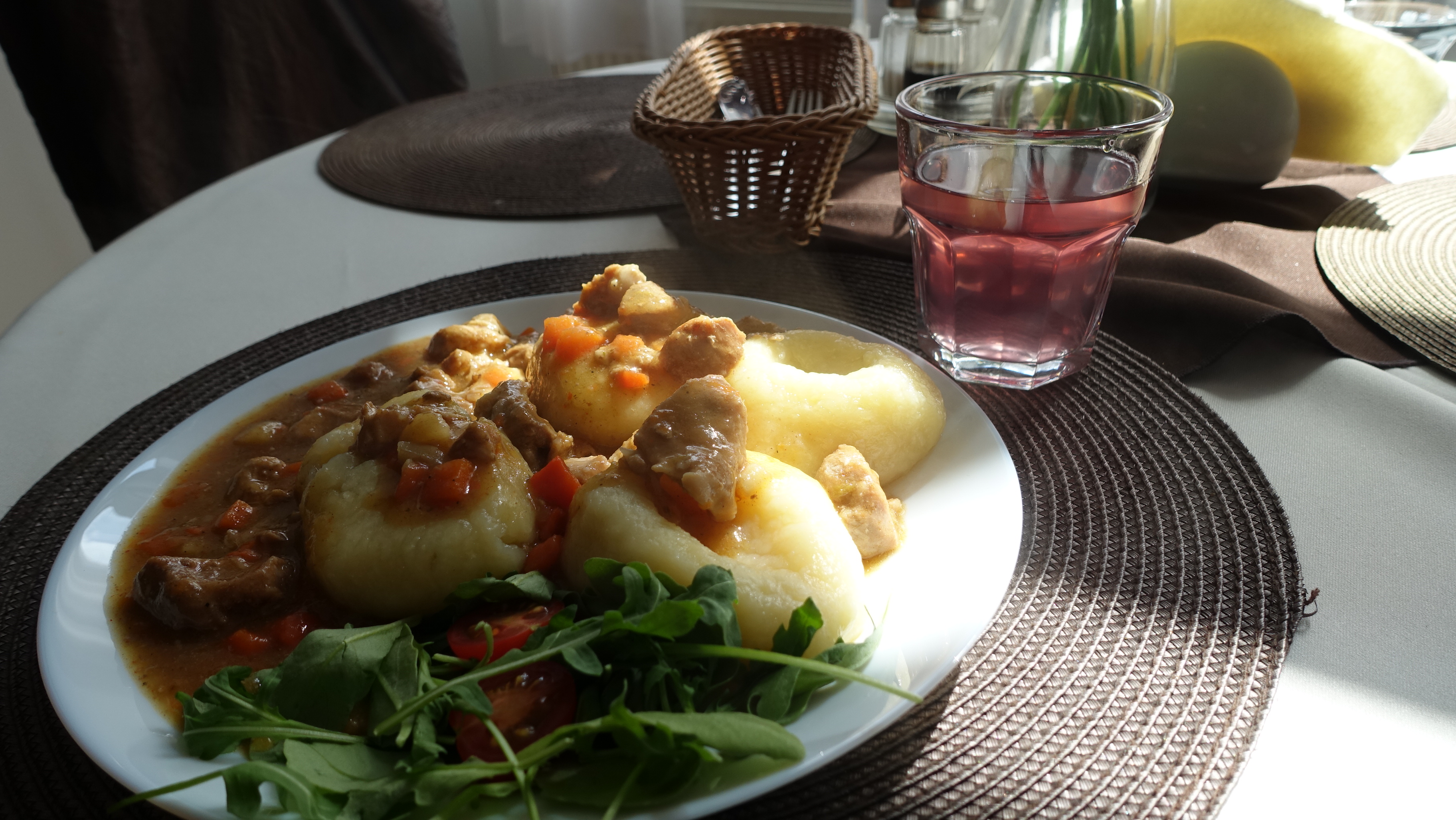 Dzisiaj była to zupa ogórkowa oraz gulasz wieprzowy z kluskami śląskimi, surówką z buraczków oraz kompot.