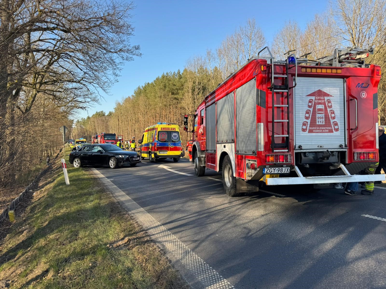 Droga jest zablokowana. Wyznaczono objazdy przez Waniorowo i Baszewice. Na miejscu pracują policjanci pod nadzorem prokuratora. Wezwano także biegłego z zakresu ruchu drogowego i rekonstrukcji wypadków drogowych. W działaniach brały udział również trzy zastępy straży pożarnej i cztery zespoły ratownictwa medycznego. Do szpitala została przetransportowana jedna osoba.