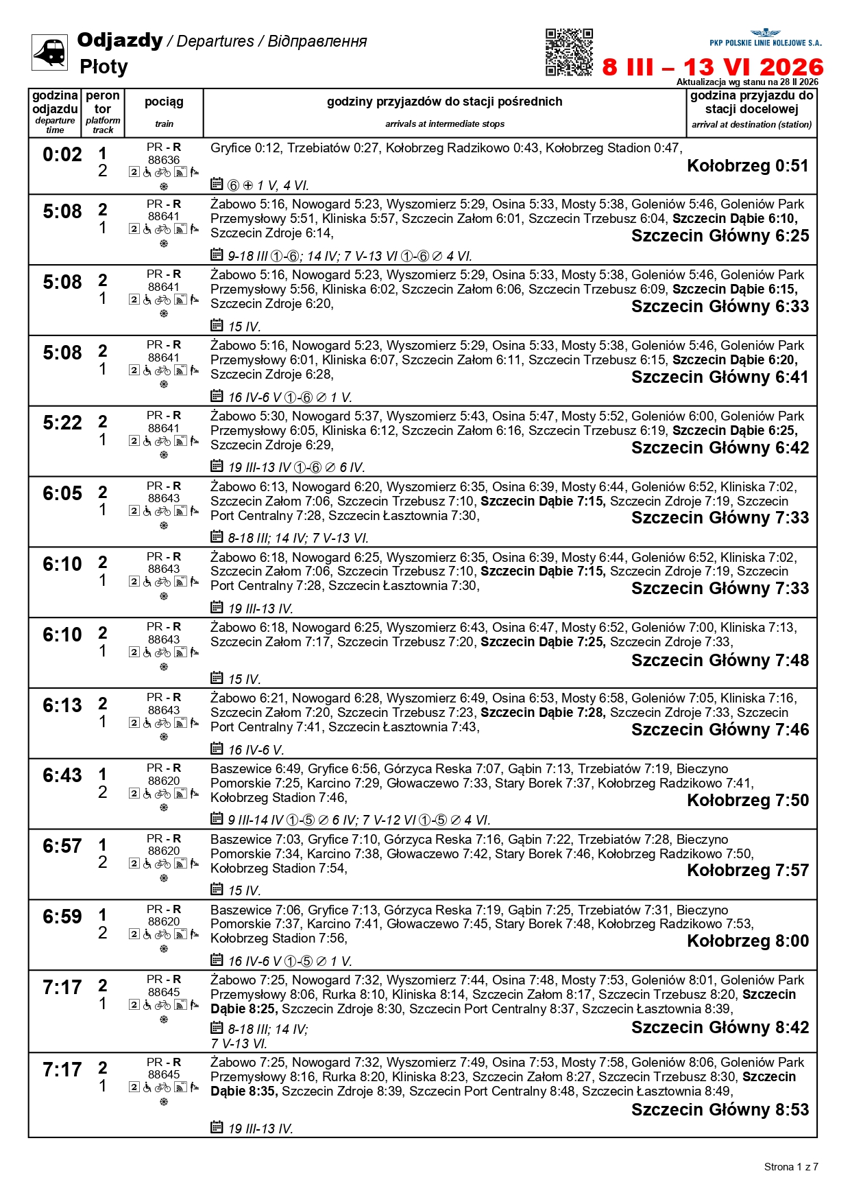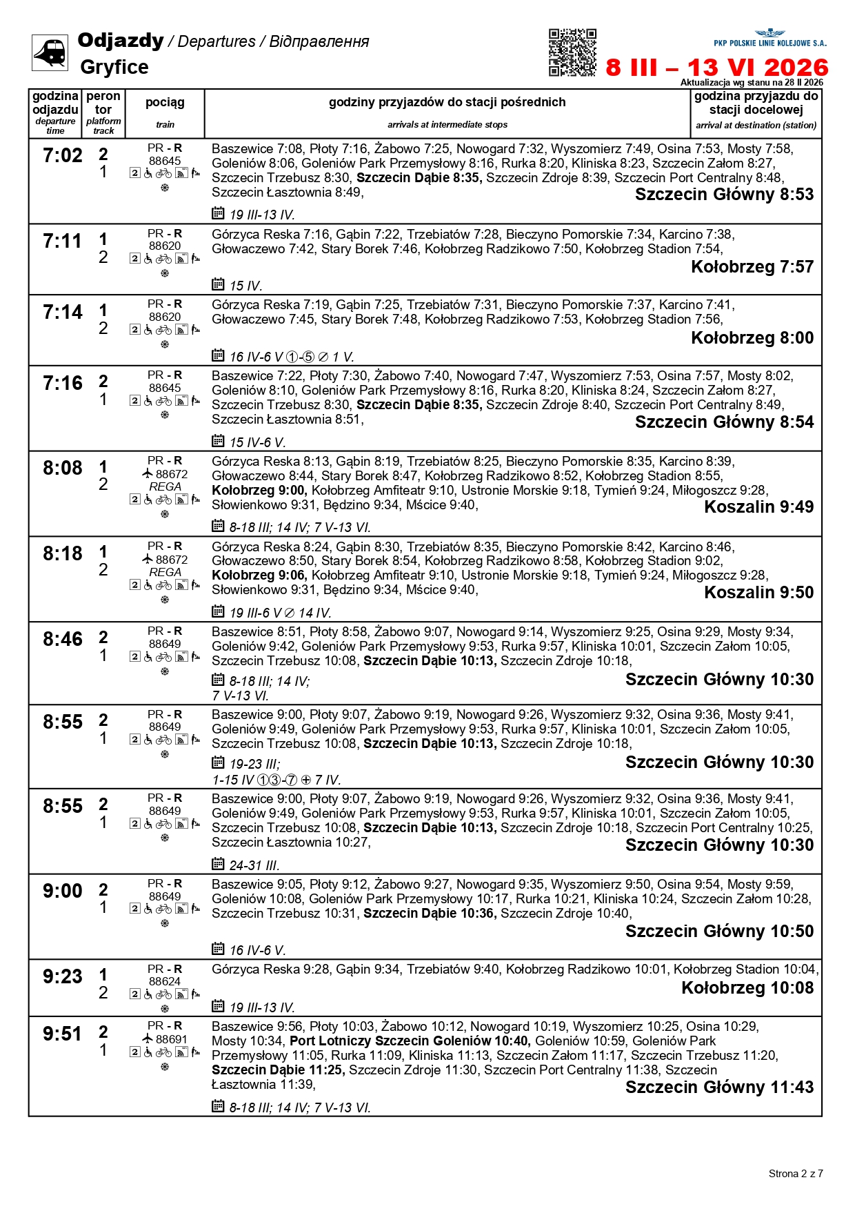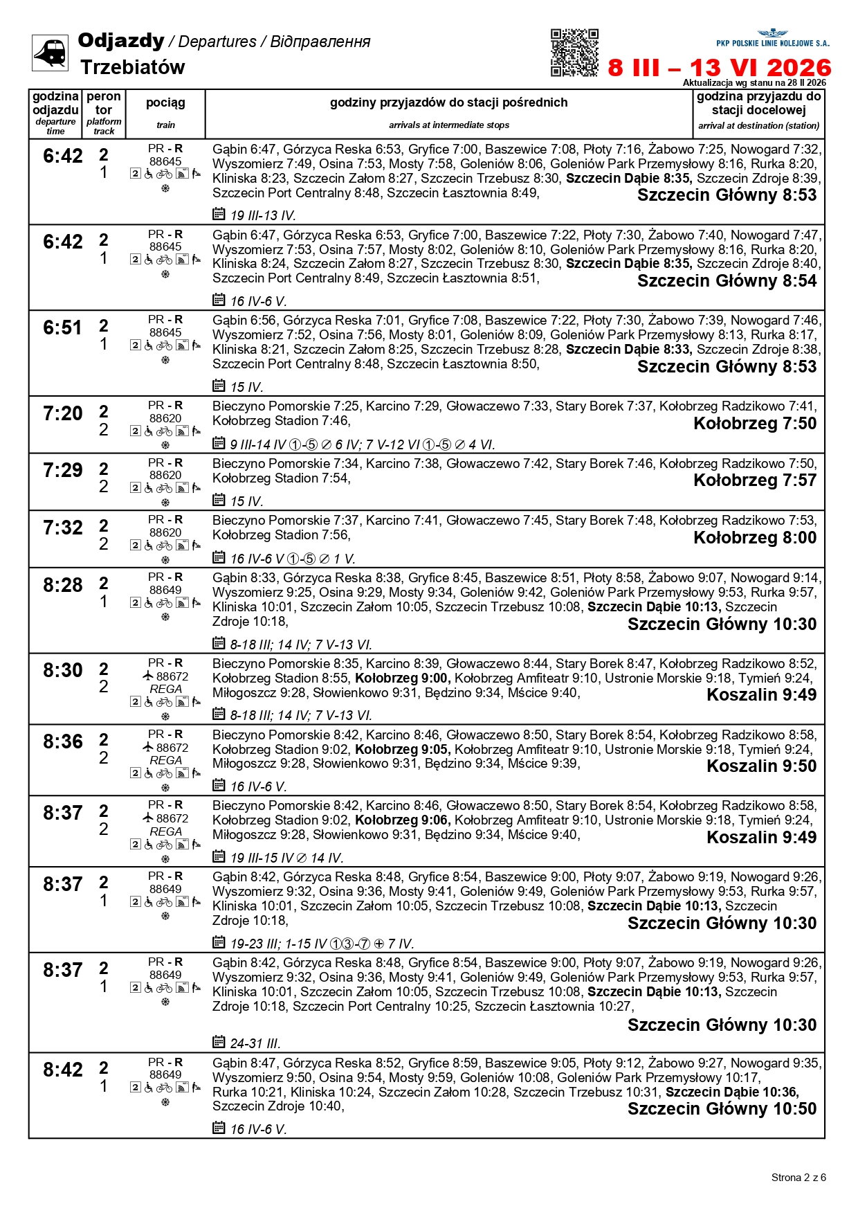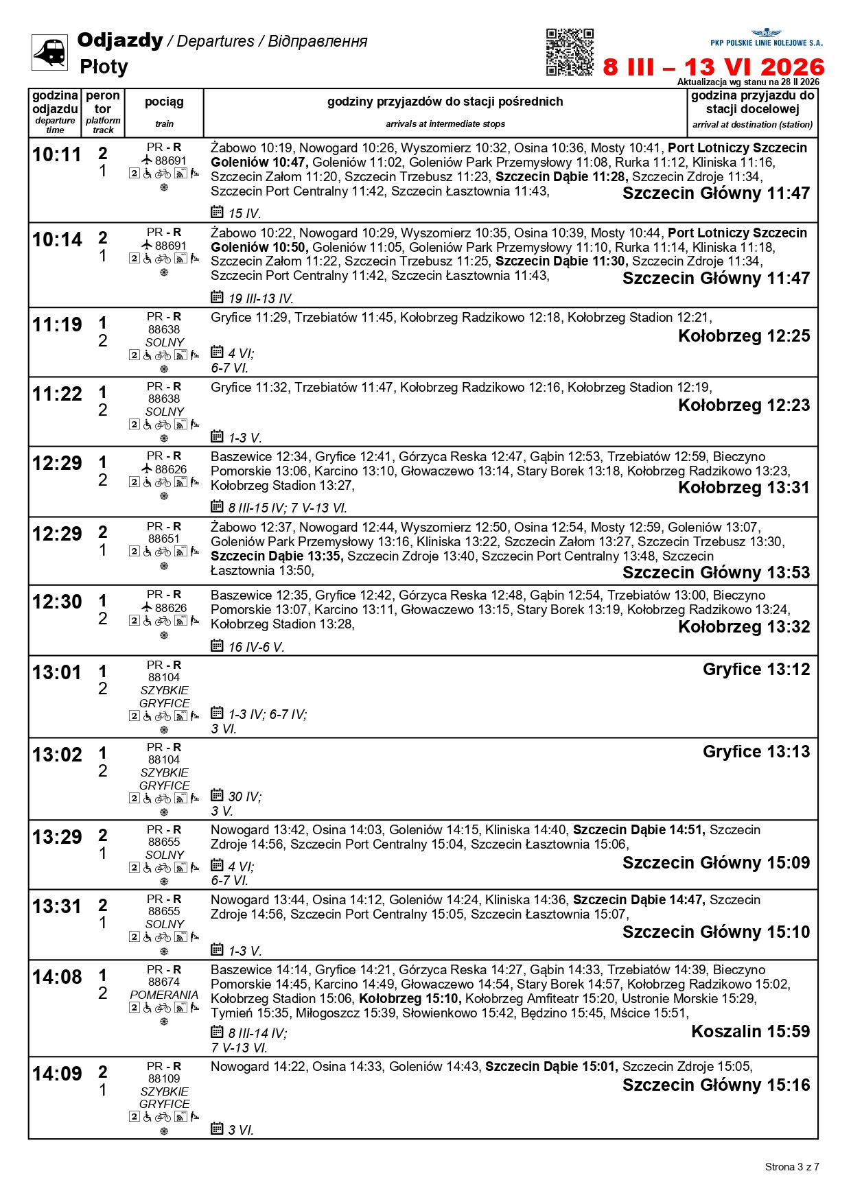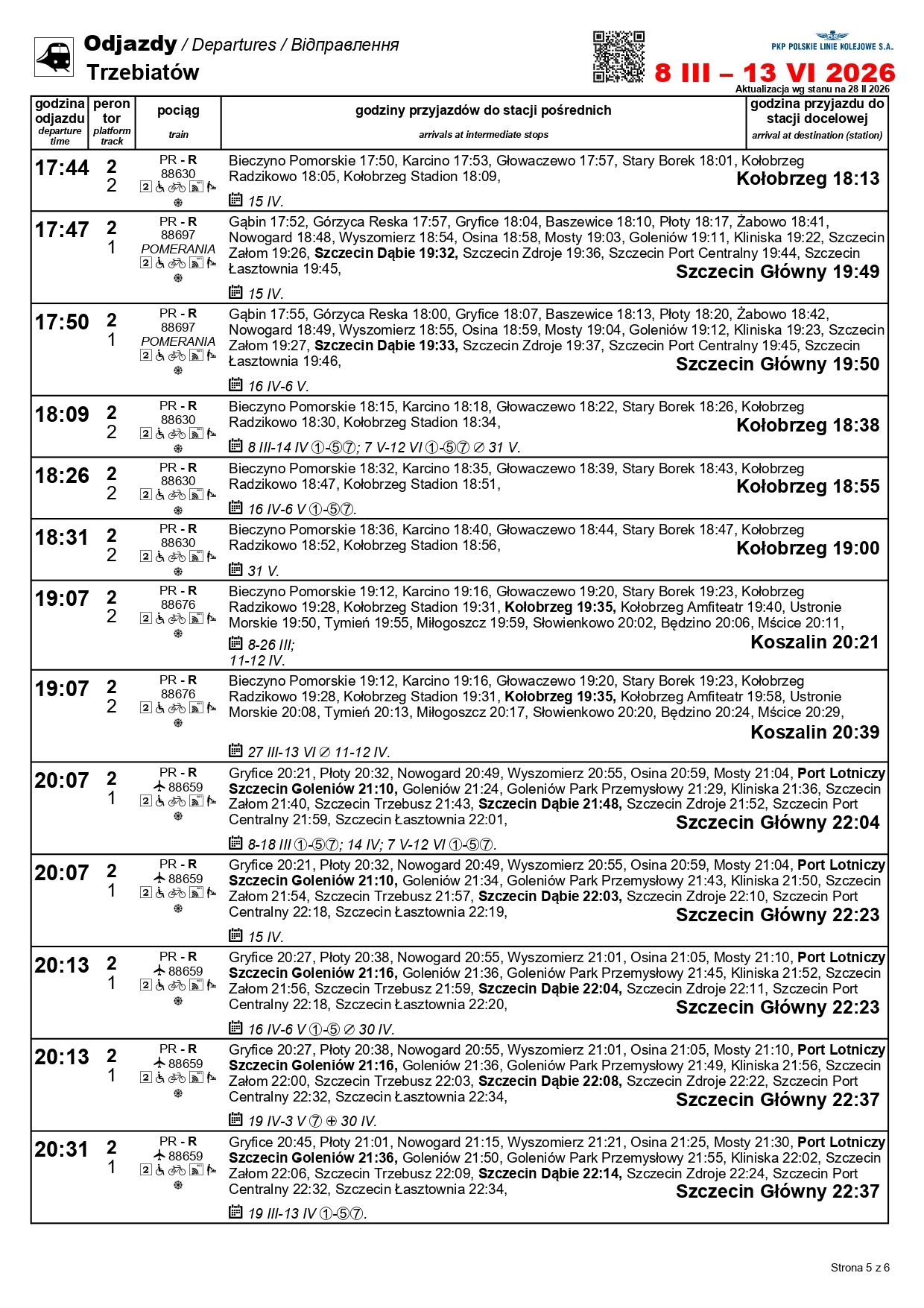 Nowością będzie para pociągów w relacji Szczecin Główny–Kołobrzeg. „Solny” będzie kursować między 1 a 3 maja oraz 4 i 6-7 czerwca. Skład wyruszy ze Szczecina o godz. 10:11, a z Kołobrzegu o godz. 12:31. Uzupełnieniem dla oferty na tej trasie będzie para przyspieszonych pociągów w relacji Szczecin Główny–Gryfice. Podróżni skorzystają z nich 1-3, 6-7 i 30 kwietnia, a także 3 maja i 3 czerwca.