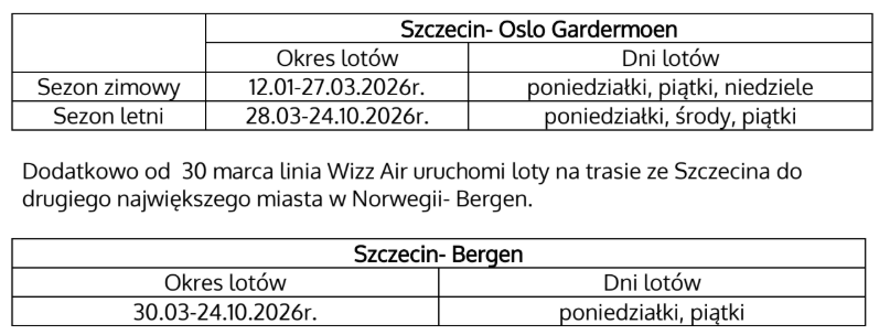 Od dziś, tj. od 12 stycznia, linia lotnicza Wizz Air zwiększa liczbę połączeń pomiędzy Portem Lotniczym Szczecin–Goleniów a głównym lotniskiem stolicy Norwegii – Oslo Gardermoen. Dotychczasowa liczba rejsów zostaje zwiększona do trzech połączeń w tygodniu.