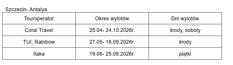 Riwiera Turecka od lat przyciąga turystów słoneczną pogodą, szerokimi plażami oraz bogatą ofertą hoteli w standardzie all- inclusive. To także miejsce, gdzie nowoczesna infrastruktura turystyczna łączy się z dziedzictwem starożytnych cywilizacji i wyjątkową kuchnią. Docelowo w szczycie sezonu na zlecenie touroperatorów: Coral Travel, TUI, Itaka  oraz Rainbow realizowane będą 4 wyloty w tygodniu wg poniższego harmonogramu: