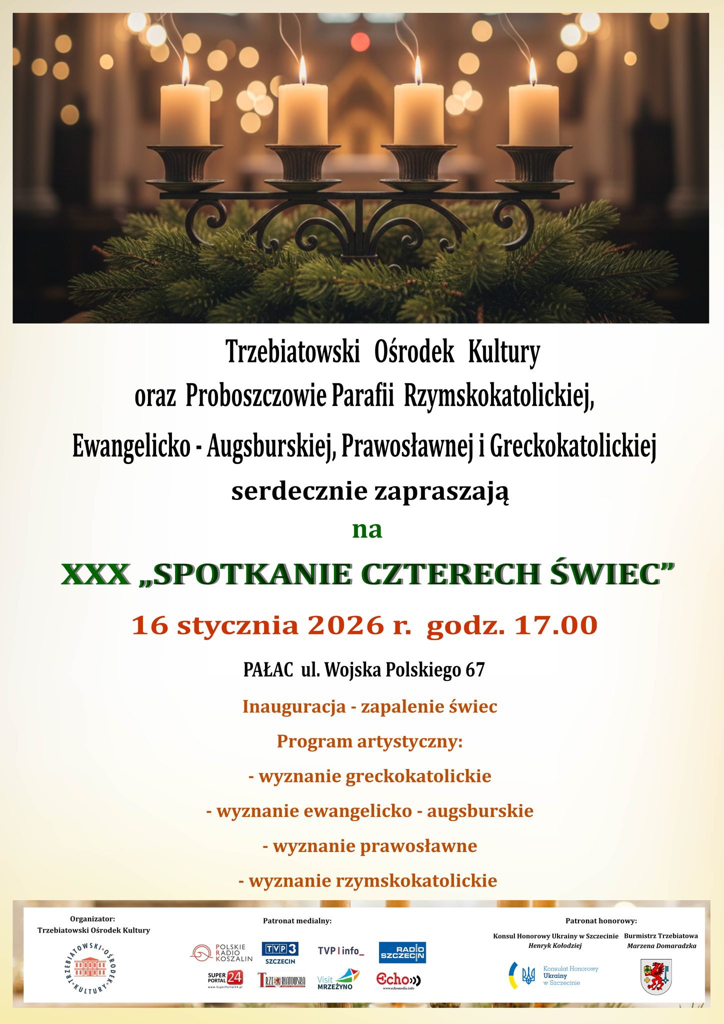 XXX Spotkanie Czterech Świec odbędzie się 16 stycznia 2026 roku (piątek) o godzinie 17:00 w Trzebiatowskim Ośrodku Kultury. Uroczystość rozpocznie się symboliczną inauguracją poprzez tradycyjne zapalenie świec. W programie przewidziano również część artystyczną przygotowaną przez przedstawicieli wyznań greckokatolickiego, ewangelicko-augsburskiego, prawosławnego oraz rzymskokatolickiego. Spotkanie ma charakter refleksyjny i podkreśla znaczenie dialogu oraz wzajemnego szacunku w lokalnej społeczności. Wydarzenie zostało objęte patronatem honorowym Konsula Honorowego Ukrainy w Szczecinie Henryka Kołodzieja oraz Burmistrz Trzebiatowa Marzeny Domaradzkiej.
