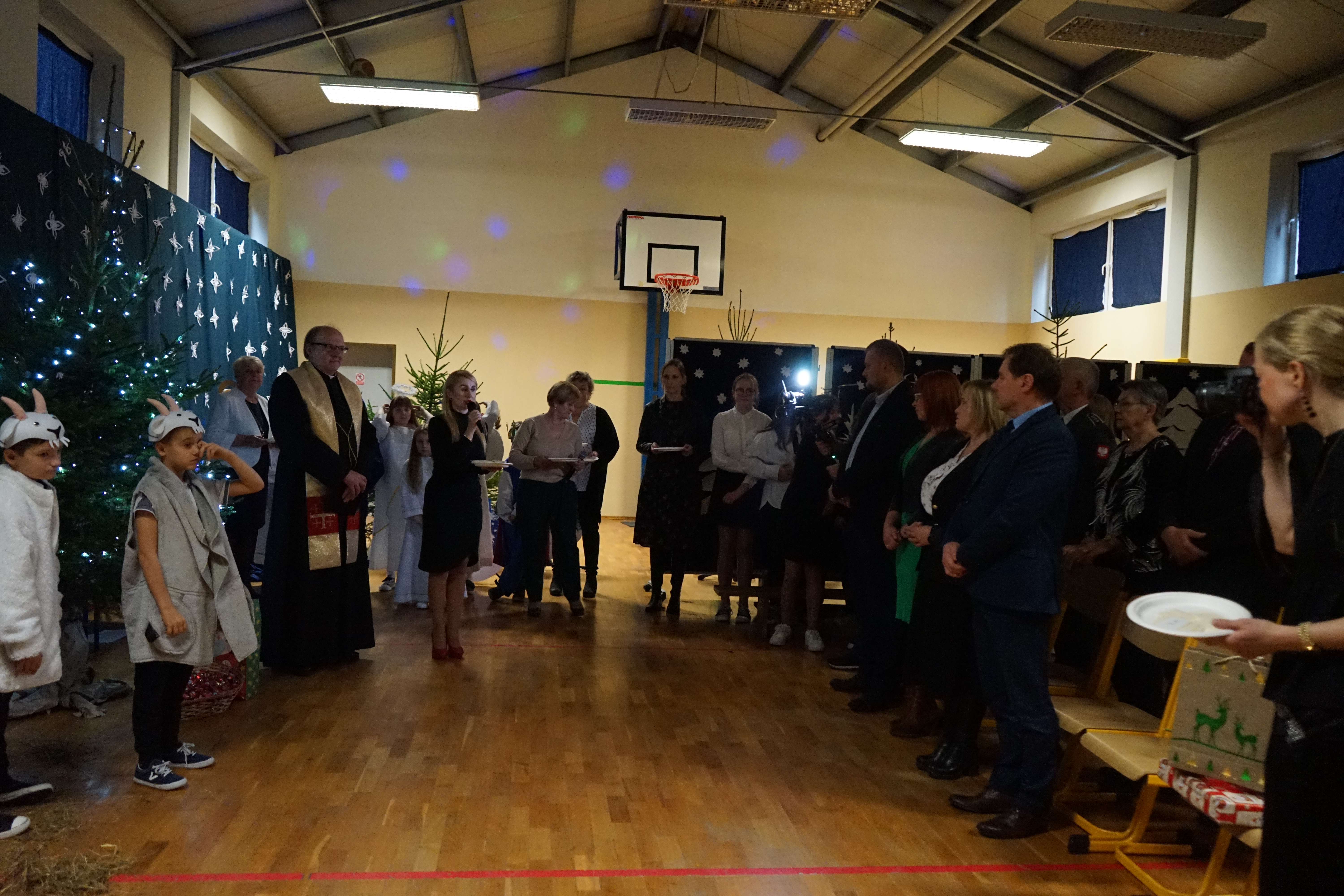 Na zakończenie tej wyjątkowej uroczystości głos zabrali zaproszeni goście i złożyli wszystkim przybyłym bożonarodzeniowe życzenia wszelkiej pomyślności, radości i szczęścia oraz przekazali prezenty dla uczniów na ręce pani Dyrektor. Wigilijne spotkanie zakończył ks. Proboszcz, który po przeczytaniu Ewangelii według Świętego Łukasza rozdał opłatek , aby wszyscy obecni na Jasełkach mogli się nim podzielić.