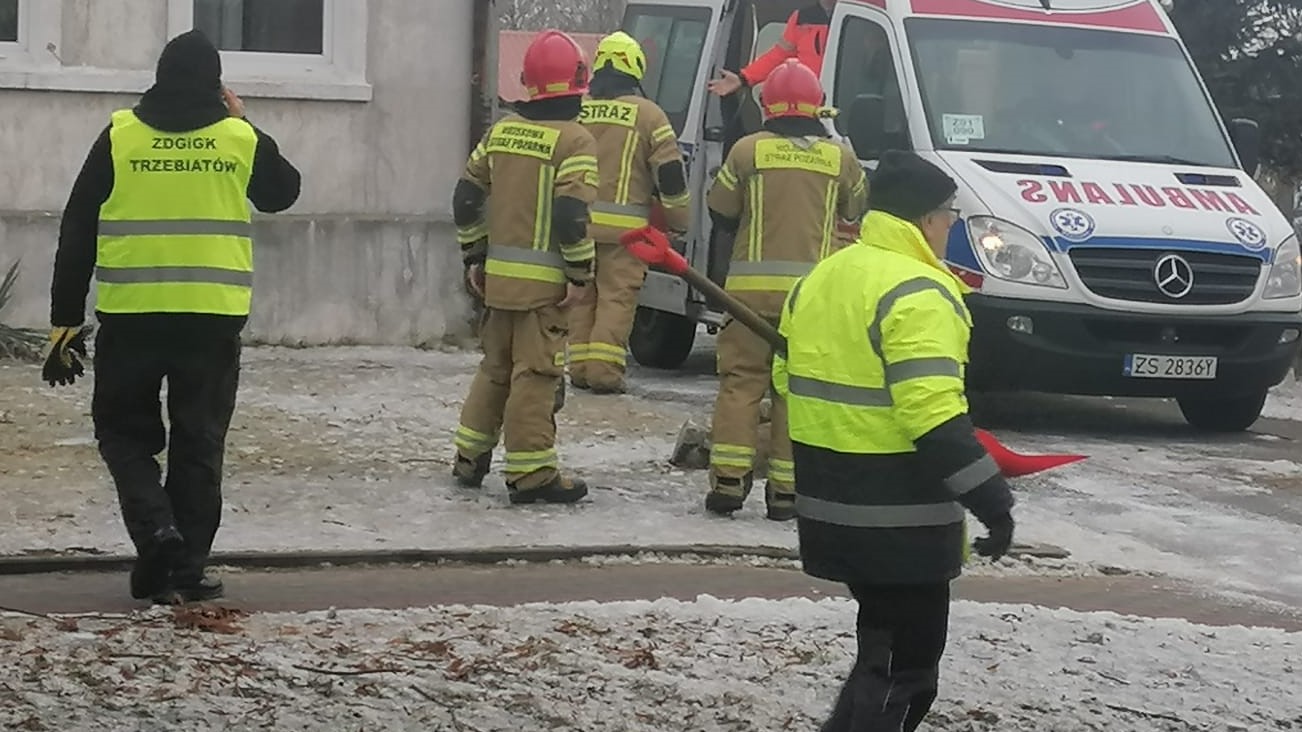 Na miejscu byli również pracownicy Zarządu Dróg Gminnych i Gospodarki Komunalnej w Trzebiatowie, którzy zadbali o bezpieczny dojazd służb bezpośrednio pod blok w trudnych, śliskich warunkach.
