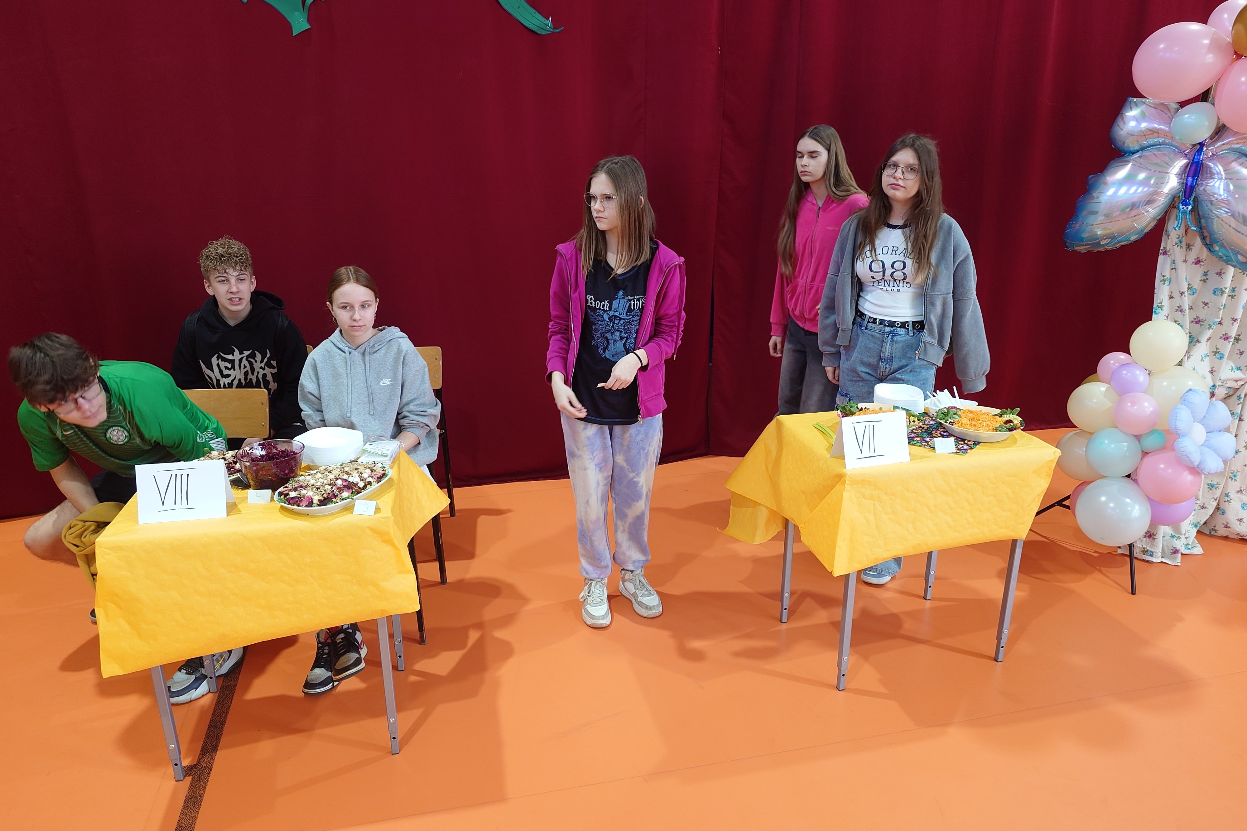 Główną atrakcją wydarzenia było przygotowanie i prezentacja surówek przez uczniów. Każda klasa wylosowała jedno warzywo, które stało się głównym składnikiem ich potrawy. Na stołach pojawiły się kompozycje z marchwi, kapusty pekińskiej, białej i kiszonej, buraków, pora czy selera, które zachwycały smakiem i estetyką podania. Przygotowując surówki, uczniowie nie tylko doskonalili swoje umiejętności kulinarne, ale również uczyli się wartości odżywczych warzyw i znaczenia zdrowego odżywiania. Po degustacji można było oddać głos na najsmaczniejszą surówkę. Bezkonkurencyjna okazała się sałatka z kapusty pekińskiej przygotowana przez klasę VI a.