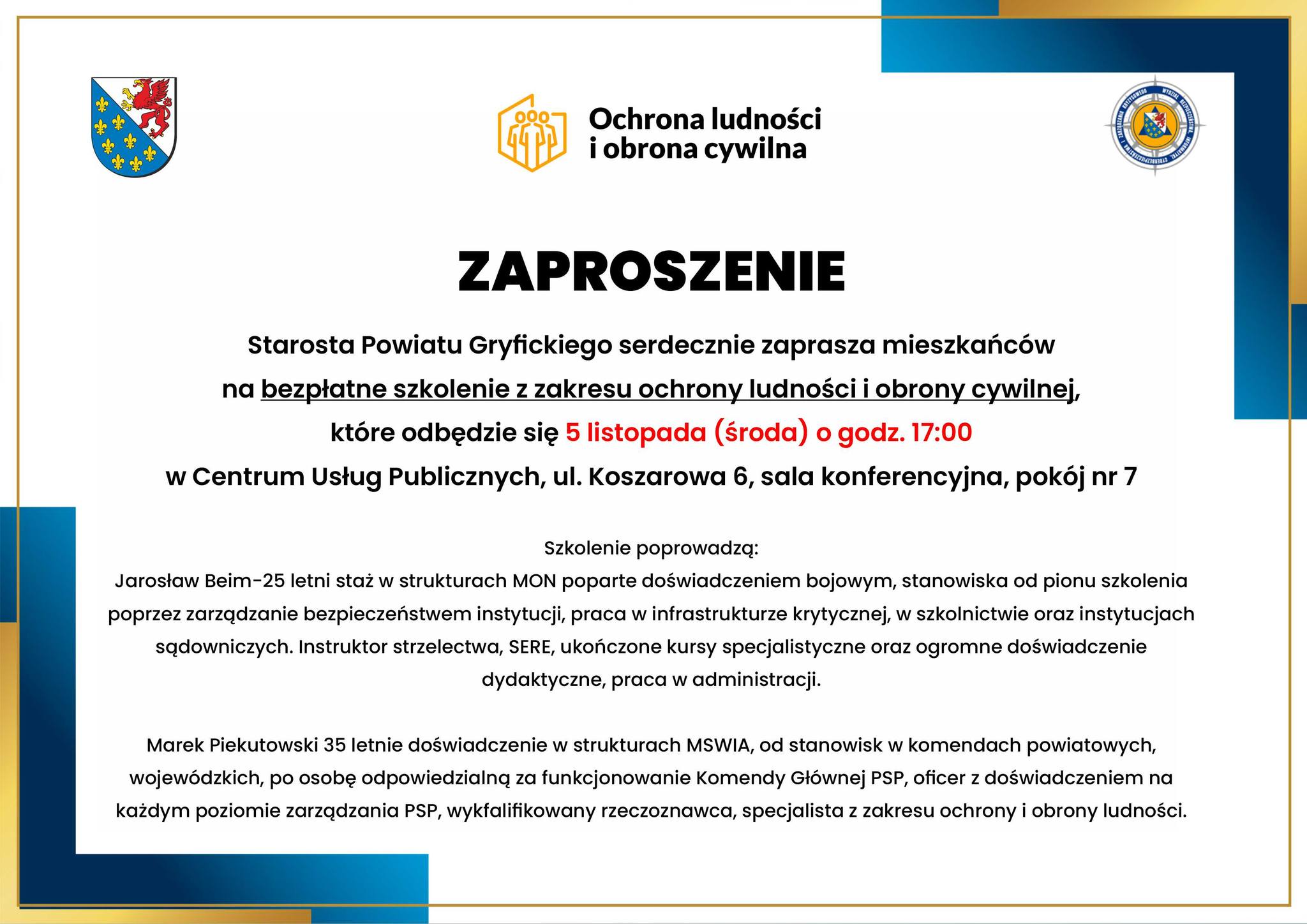 Szkolenie poprowadzą doświadczeni eksperci: Jarosław Beim – specjalista z 25-letnim stażem w strukturach MON, instruktor strzelectwa i SERE, z doświadczeniem w pracy w infrastrukturze krytycznej i administracji; oraz Marek Piekutowski – ekspert z 35-letnim doświadczeniem w strukturach MSWiA i PSP, specjalista z zakresu ochrony ludności i zarządzania kryzysowego.
