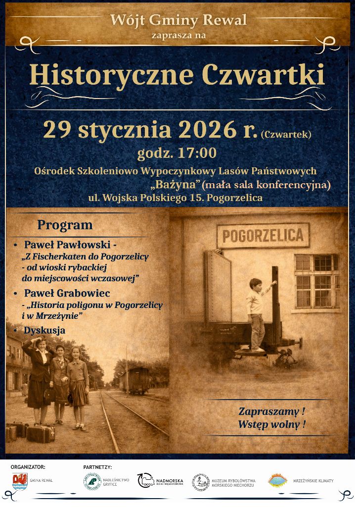 Wójt Gminy Rewal Konstanty Tomasz Oświęcimski zaprasza mieszkańców na spotkanie z cyklu „Historyczne czwartki”, które odbędzie się w czwartek, 29 stycznia, w małej sali konferencyjnej Ośrodka Szkoleniowo-Wypoczynkowego „Bażyna” w Pogorzelicy.