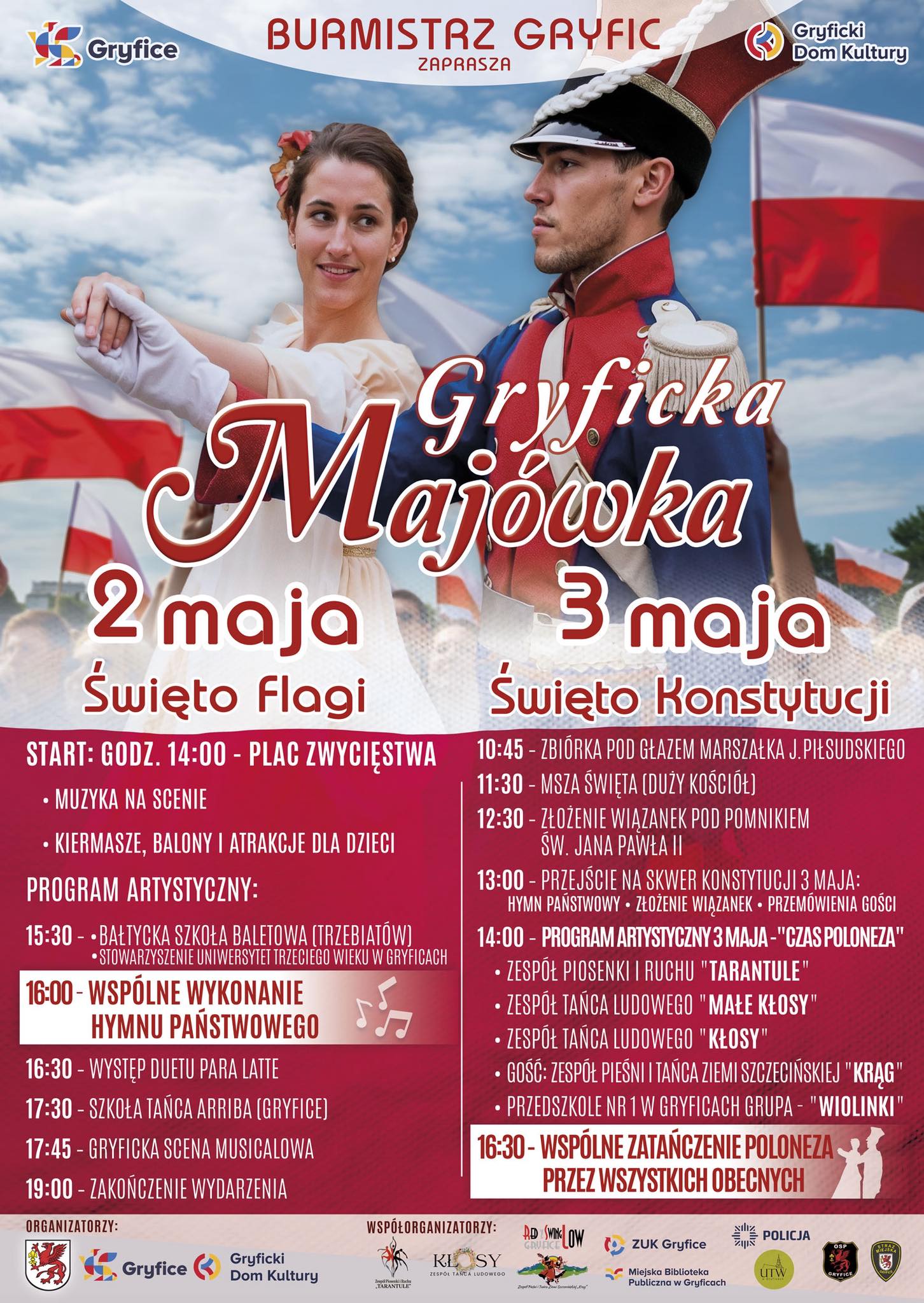 Majówkowe świętowanie rozpocznie się 2 maja na Placu Zwycięstwa. Od popołudnia zaplanowano muzykę na scenie, kiermasze, atrakcje dla dzieci i program artystyczny. Wystąpią m.in. Bałtycka Szkoła Baletowa z Trzebiatowa, Stowarzyszenie Uniwersytet Trzeciego Wieku, duet Para Latte, Szkoła Tańca Arriba i Gryficka Scena Musicalowa. Jednym z ważniejszych momentów będzie wspólne wykonanie hymnu państwowego.