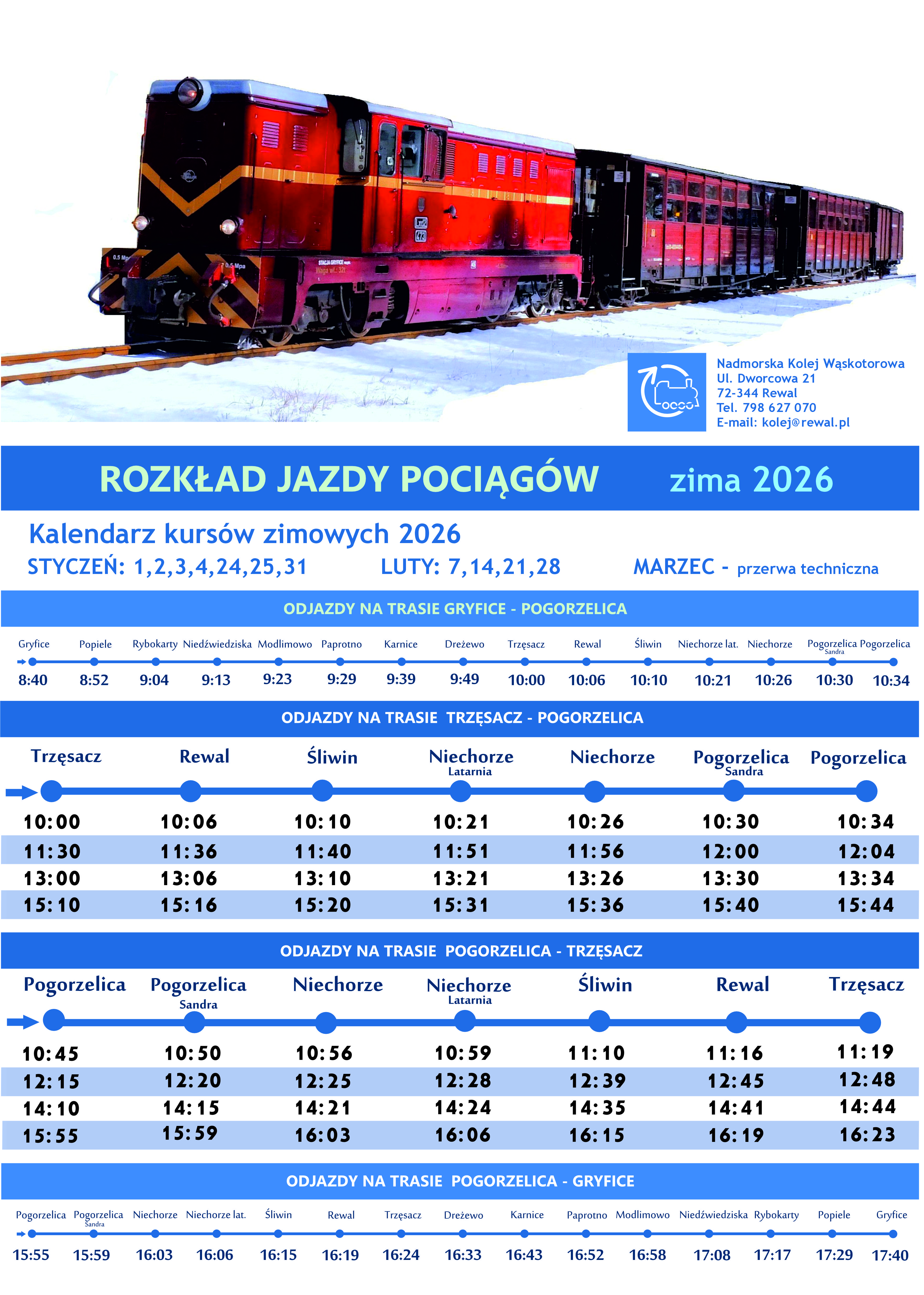 Już niebawem rozpoczną się ferie, a dzieci i młodzież szkolna, korzystając z zimowej przerwy w nauce wyjedzie na zimowiska i rodzinne urlopy. W związku z tym Nadmorska Kolej Wąskotorowa zaprasza wszystkich, którzy planują spędzić okres ferii zimowych na rewalskim wybrzeżu na przejażdżki po wąskotorowym szlaku Gminy Rewal. W tym roku zaplanowaliśmy kursy we wszystkie soboty od 24 stycznia do 28 lutego 2026 r. oraz w niedzielę, 25 stycznia. Pociągi kursować będą 4 razy dziennie, zgodnie z zimowym rozkładem jazdy.