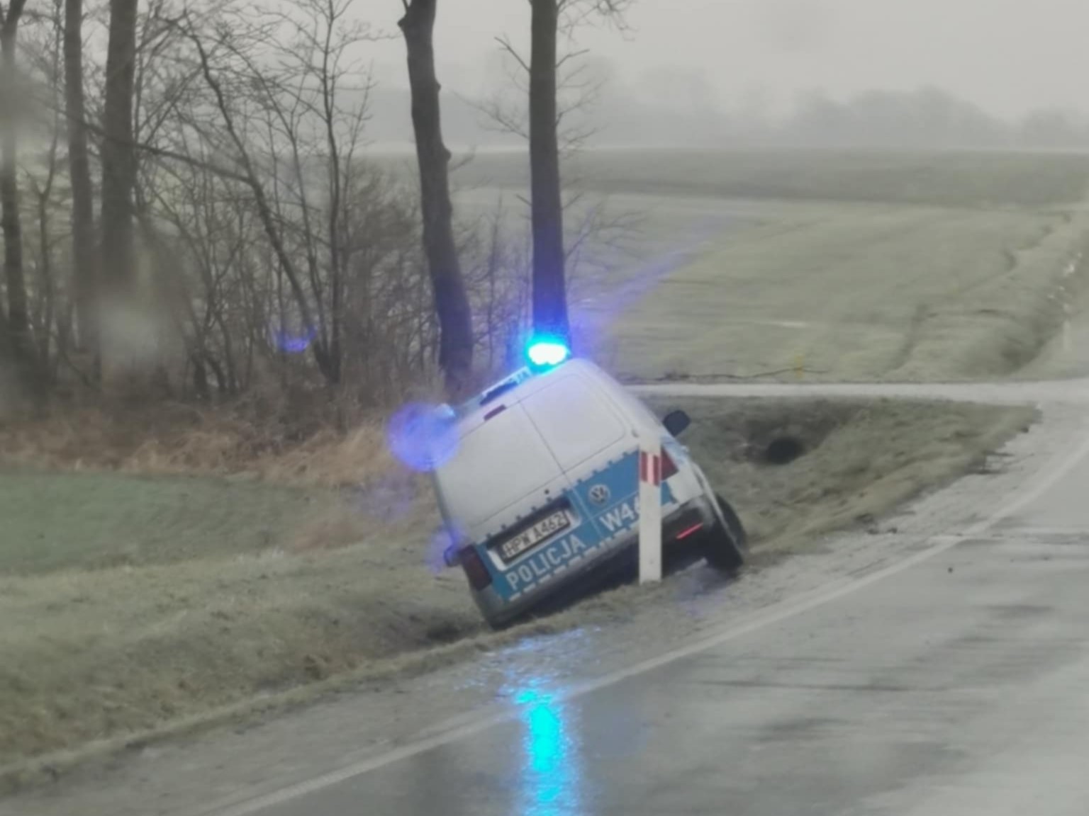 O trudnych warunkach na drodze przekonali się również policjanci jadący na interwencję. Radiowóz wpadł do rowu w okolicach miejscowości Włodarka (gmina Trzebiatów). Na tej samej trasie poza jezdnią znalazła się także laweta i inne pojazdy.