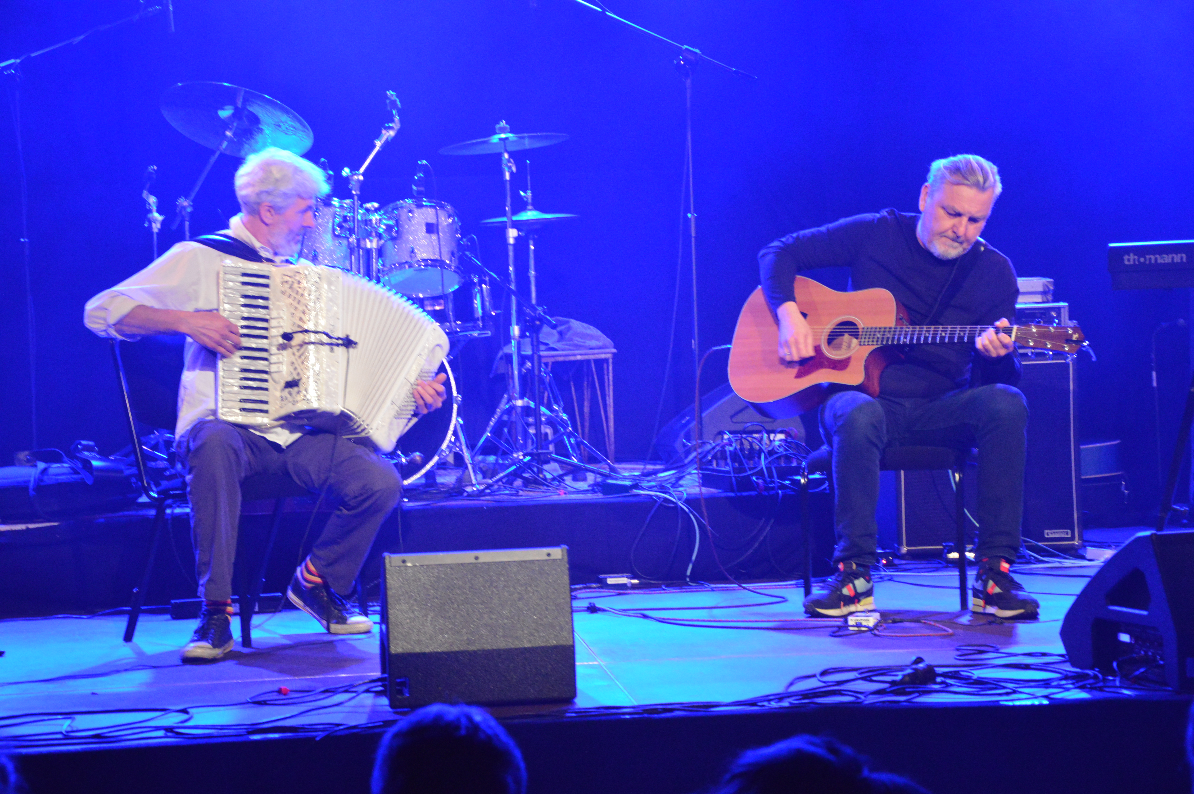 Na scenie pojawił się duet Silver Guns, stworzony przez goleniowskiego gitarzystę Jarka Chilkiewicza oraz Jacka Hałasa, który lubuje się w zapisach etnografów, domowych archiwach i praktykuje grę na tradycyjnym instrumencie wędrownych śpiewaków – lirze korbowej. Muzycy wzięli na warsztat prawdopodobnie najstarsze znane pieśni słowiańskie z XIII wieku, autorstwa Wisława z Rugii, i właśnie w Rampie zaprezentowali je prapremierowo. Na razie bez wokali, publiczność otrzymała więc jedynie przedsmak tego, co znajdzie się na płycie, już teraz jednak założyć można, że będzie ona czymś niezwykłym. Tymczasem zapraszamy do obejrzenia garści zdjęć z wczorajszego wieczoru w Rampie.