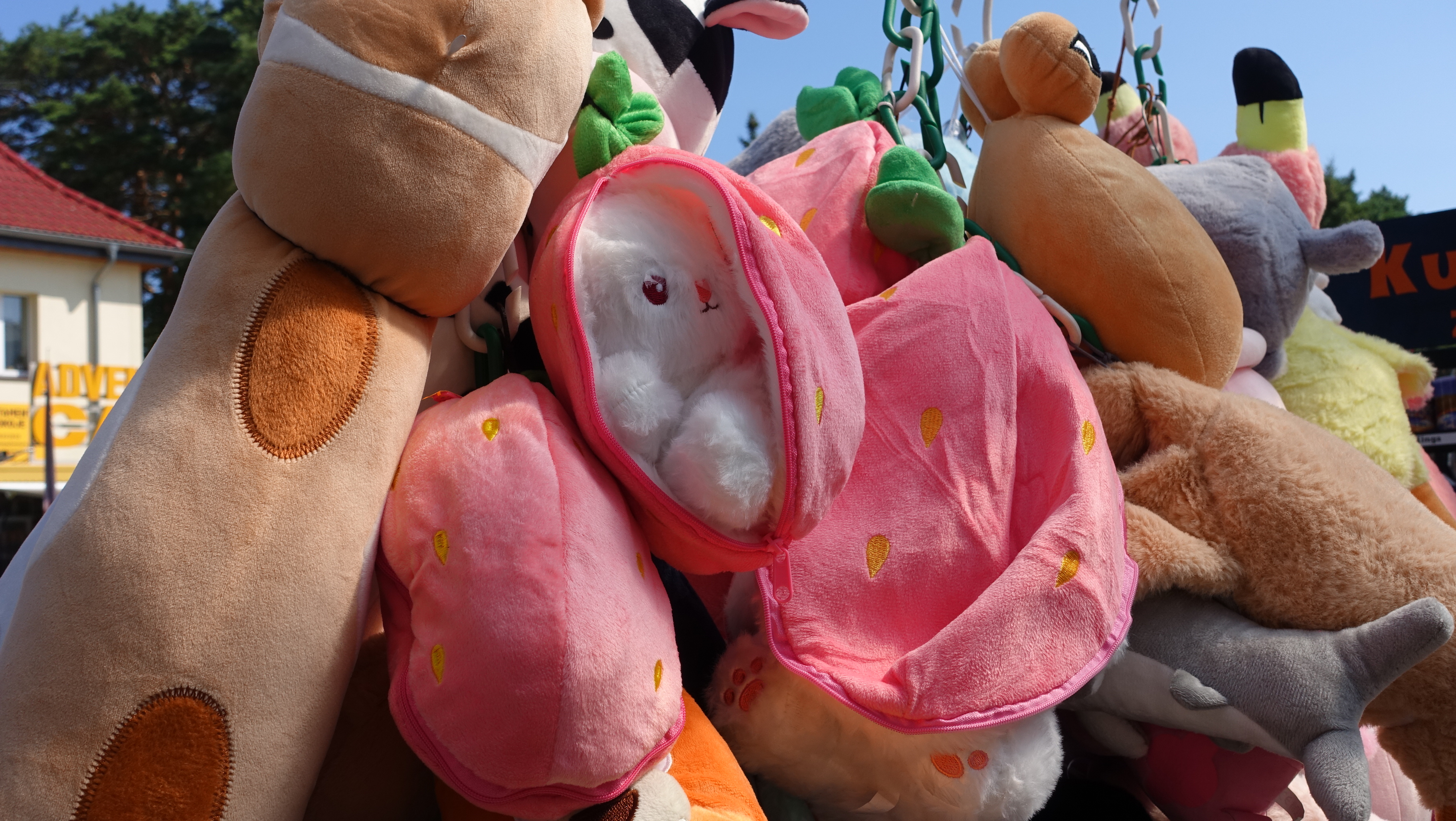 Inna sprzedająca jako tegoroczny hit wskazuje królika w truskawce. Co ciekawe, są też wersje z marchewką i ananasem. Podobnie jak Pou, możemy go kupić w różnych rozmiarach w cenie od ok. 20 do nawet 80 zł. Tu jednak na próżno szukać, skąd się wziął jego fenomen.