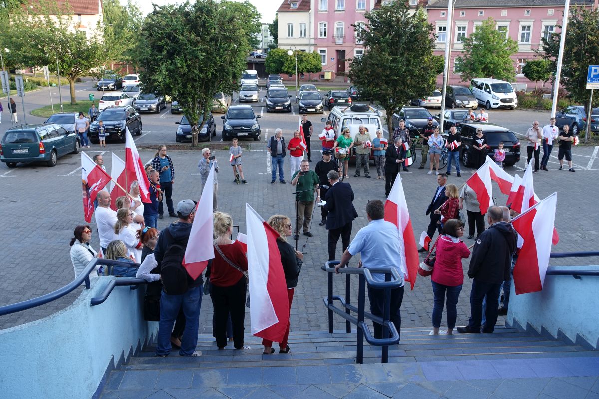 Aktywnie, co może być nieco zaskakujące, udział w demonstracji brały udział osoby przede wszystkim spoza Goleniowa, a wszystkiemu przyszłuchiwała się niewielka grupka mieszkańców naszego miasta. Na koniec odśpiewany został Mazurek Dąbrowskiego, jeszcze w trakcie przemówień do barierek przed wejściem do urzędu przywiązane zostały duże polskie flagi, a przed rozejściem się do domów w ziemę wbito przynajmniej kilkadziesiąt małych chorągiewek, pytając ironicznie o to, jak długo one się uchowają. Całe zamieszanie, notabene dyskretnie obstawiane przez policję, trwało kilkadziesiąt minut.
