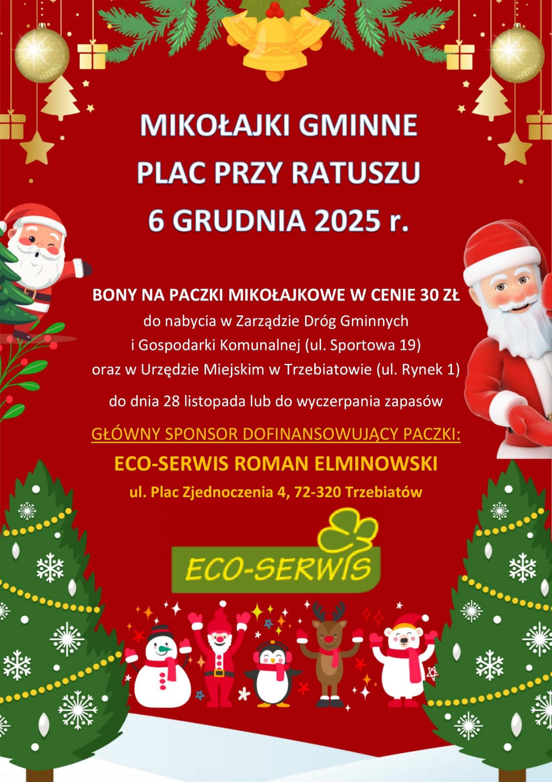 Bony na paczki mikołajkowe o wartości 30 zł dostępne są w Zarządzie Dróg Gminnych i Gospodarki Komunalnej przy ul. Sportowej 19 oraz w Urzędzie Miejskim w Trzebiatowie przy ul. Rynek 1. Można je nabyć do 28 listopada lub do wyczerpania bonów.