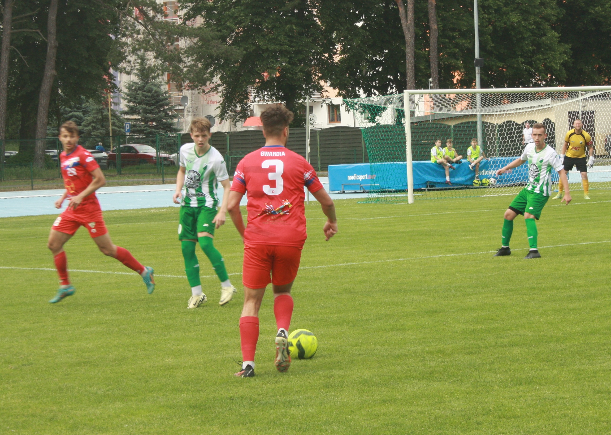 Podopieczni Mariusza Bernacha już w 3 minucie stracili gola. Biało-zieloni nie przestraszyli się wyżej notowanego rywala i w 26 minucie po celnym trafieniu grającego prezesa Piotra Winogrodzkiego doprowadzili do remisu. Wynikiem 1:1 zakończyła się pierwsza część spotkania. Druga połowa rozpoczęła się świetnie dla Iny. Najpierw w 48 minucie Henger skutecznie obronił rzut karny, a w 59 minucie Ina po składnej akcji objęła prowadzenie po celnym trafieniu Banachewicza. Niestety w 71 minucie sędzia podyktował drugi rzut karny dla gości w tym spotkaniu po faulu Winogrodzkiego, któremu pokazał czerwoną kartkę. Tym razem ekipa z Koszalina skutecznie wykonała jedenastkę i doprowadziła do remisu. Do końca spotkani wicelider atakował, jednak skutecznie bronił Henger i mecz zakończył się podziałem punktów.