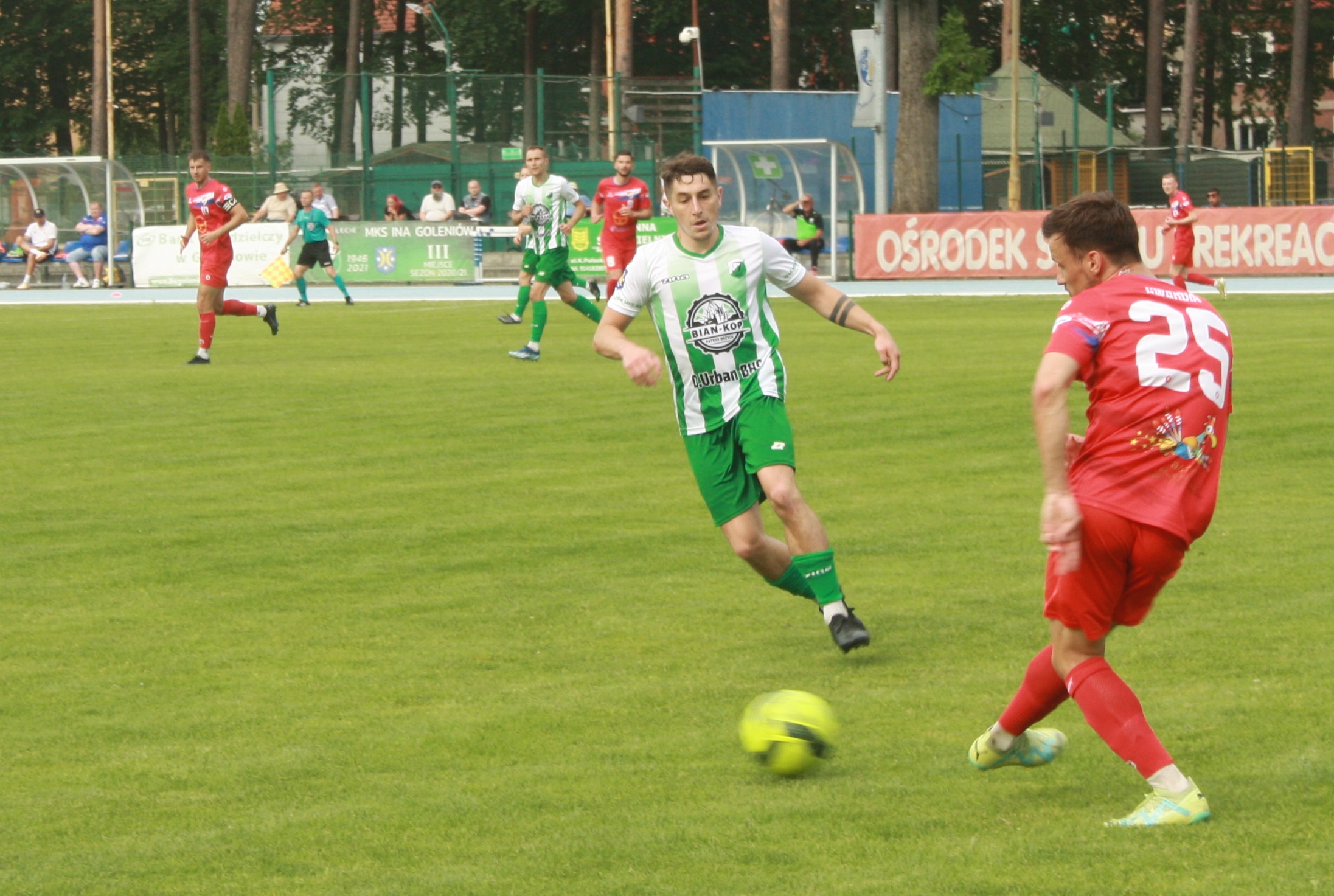 Podopieczni Mariusza Bernacha już w 3 minucie stracili gola. Biało-zieloni nie przestraszyli się wyżej notowanego rywala i w 26 minucie po celnym trafieniu grającego prezesa Piotra Winogrodzkiego doprowadzili do remisu. Wynikiem 1:1 zakończyła się pierwsza część spotkania. Druga połowa rozpoczęła się świetnie dla Iny. Najpierw w 48 minucie Henger skutecznie obronił rzut karny, a w 59 minucie Ina po składnej akcji objęła prowadzenie po celnym trafieniu Banachewicza. Niestety w 71 minucie sędzia podyktował drugi rzut karny dla gości w tym spotkaniu po faulu Winogrodzkiego, któremu pokazał czerwoną kartkę. Tym razem ekipa z Koszalina skutecznie wykonała jedenastkę i doprowadziła do remisu. Do końca spotkani wicelider atakował, jednak skutecznie bronił Henger i mecz zakończył się podziałem punktów.