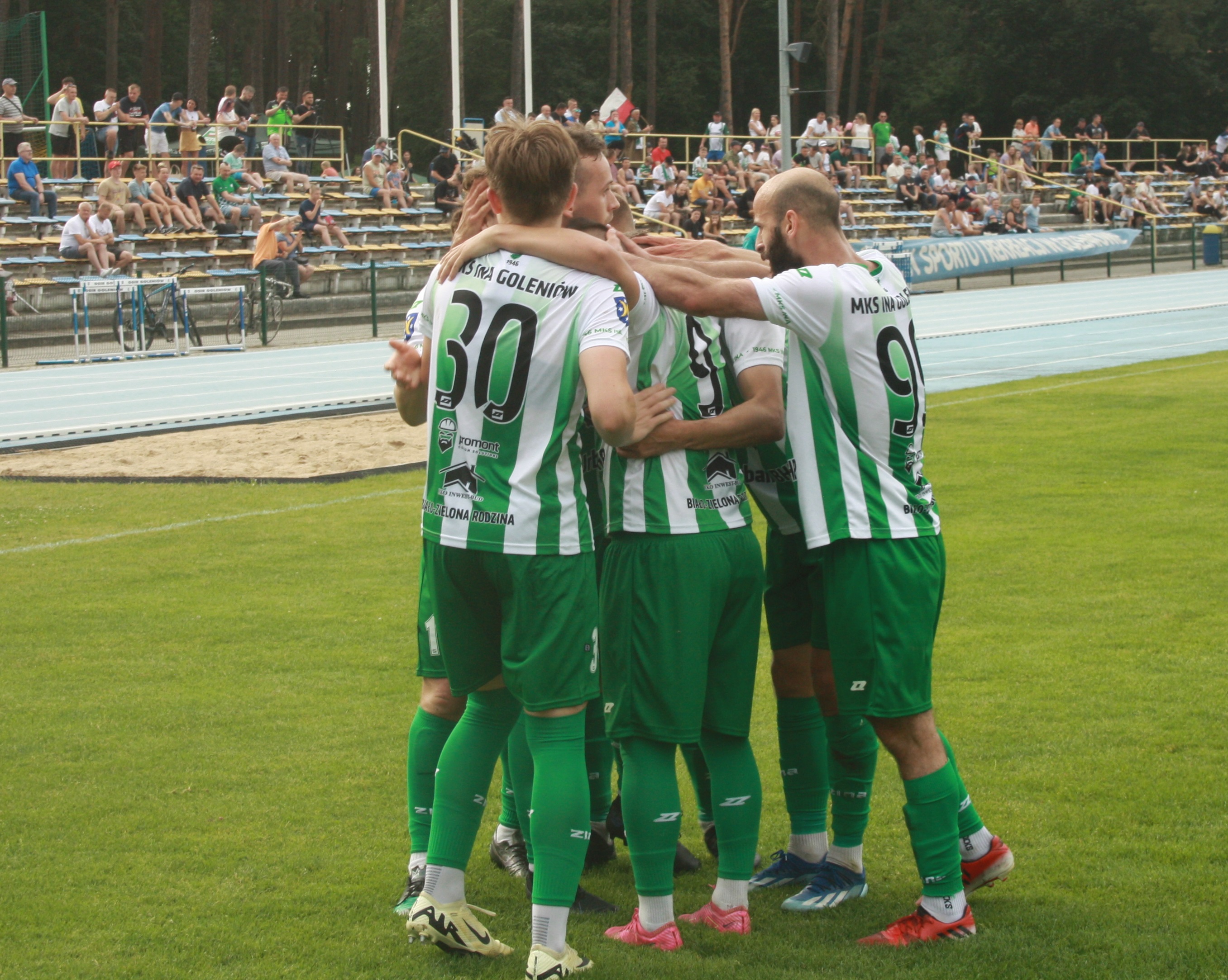 Podopieczni Mariusza Bernacha już w 3 minucie stracili gola. Biało-zieloni nie przestraszyli się wyżej notowanego rywala i w 26 minucie po celnym trafieniu grającego prezesa Piotra Winogrodzkiego doprowadzili do remisu. Wynikiem 1:1 zakończyła się pierwsza część spotkania. Druga połowa rozpoczęła się świetnie dla Iny. Najpierw w 48 minucie Henger skutecznie obronił rzut karny, a w 59 minucie Ina po składnej akcji objęła prowadzenie po celnym trafieniu Banachewicza. Niestety w 71 minucie sędzia podyktował drugi rzut karny dla gości w tym spotkaniu po faulu Winogrodzkiego, któremu pokazał czerwoną kartkę. Tym razem ekipa z Koszalina skutecznie wykonała jedenastkę i doprowadziła do remisu. Do końca spotkani wicelider atakował, jednak skutecznie bronił Henger i mecz zakończył się podziałem punktów.
