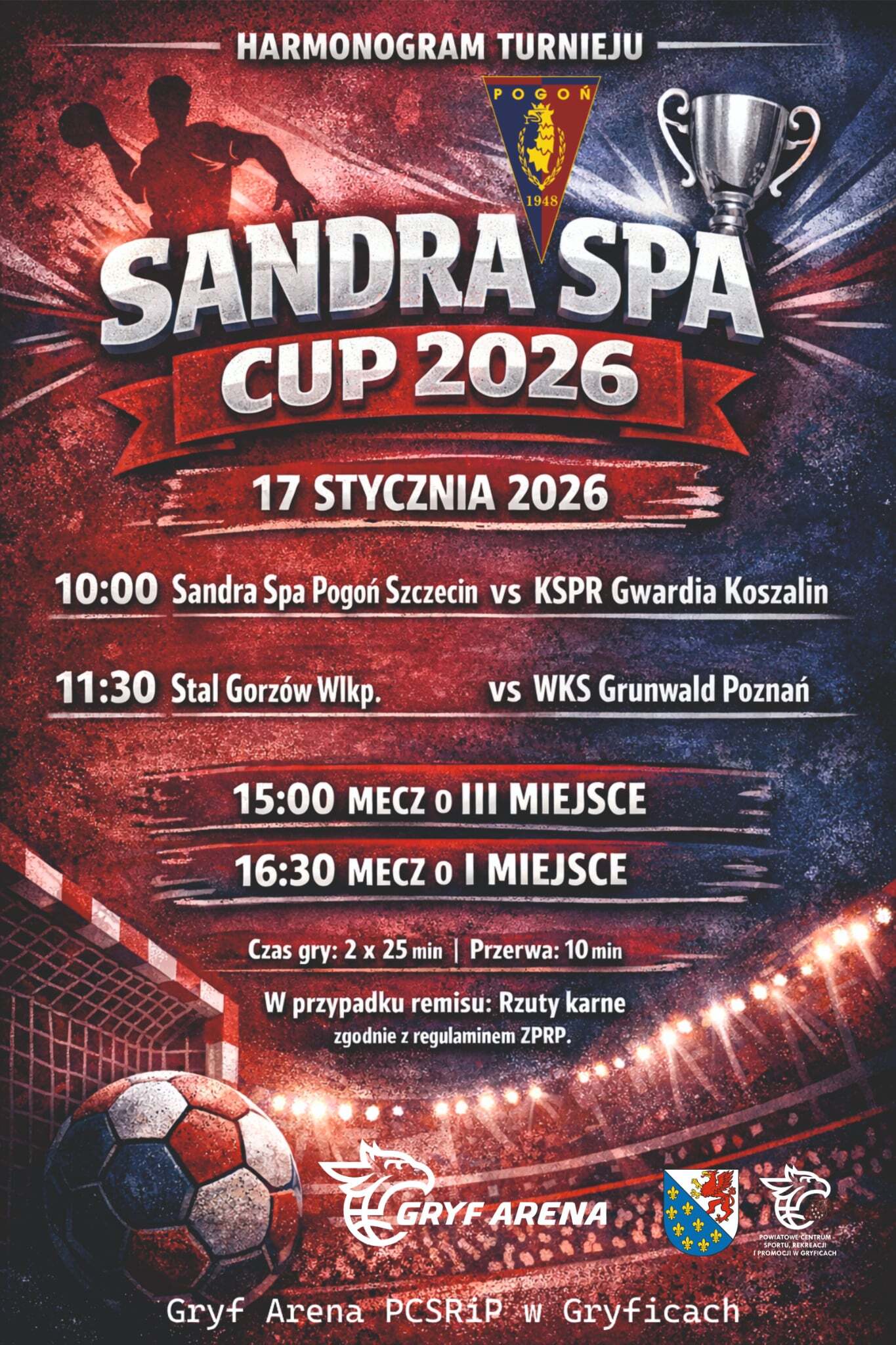 Już jutro hala widowiskowo-sportowa Gryf Arena stanie się areną prawdziwych sportowych emocji. Przed nami Sandra Spa CUP 2026 – turniej piłki ręcznej mężczyzn o Puchar Starosty Gryfickiego, w którym zmierzą się czołowe zespoły występujące na co dzień w centralnej lidze piłki ręcznej mężczyzn, czyli na zapleczu ORLEN Superliga.