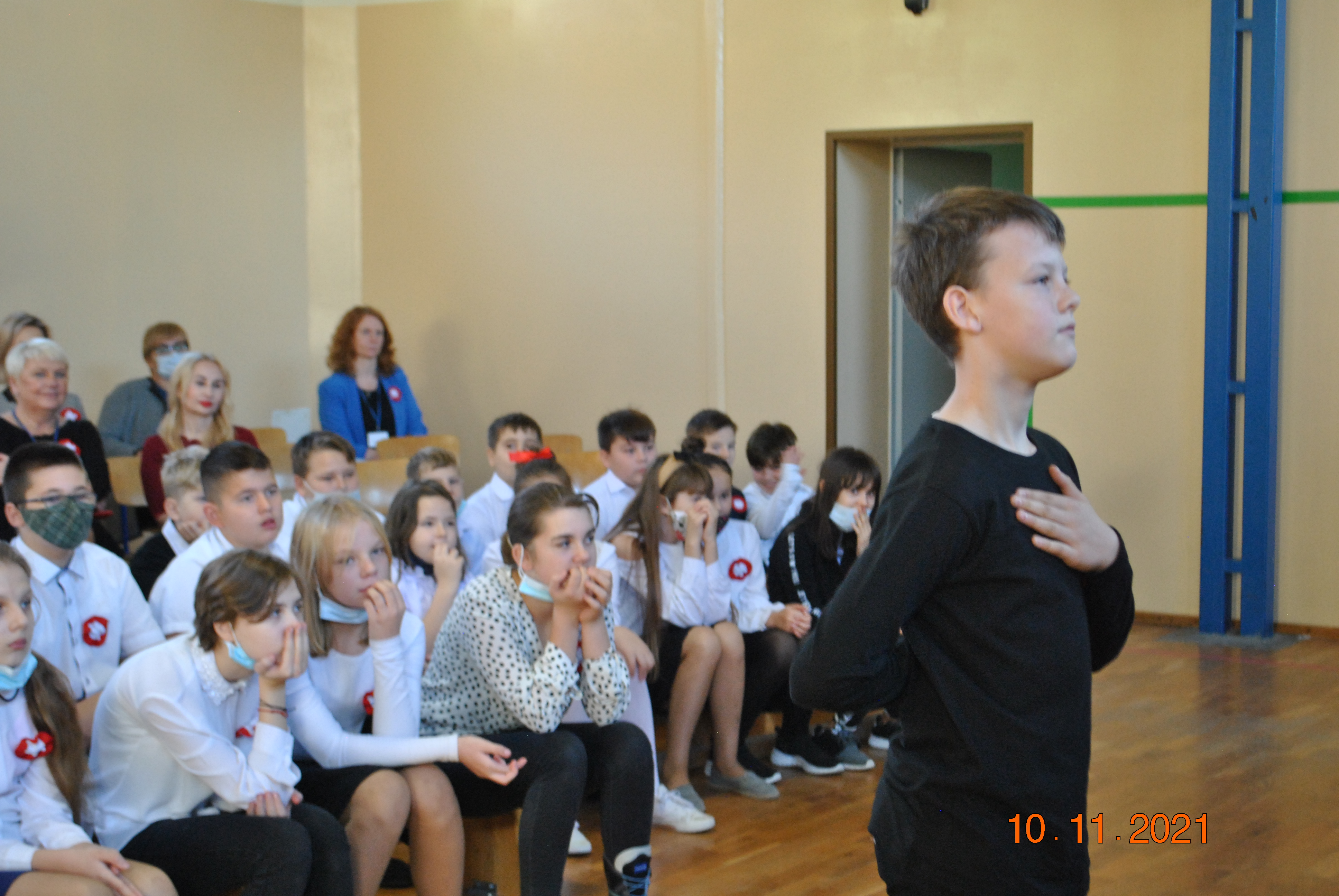 Nadszedł dzień 10 listopada. W szkole wyraźnie odczuwało się świąteczny nastrój! Wszyscy ubrani w galowe stroje, z przypiętymi biało-czerwonymi kokardami, z niecierpliwością czekali na główny element obchodów Święta Niepodległości, czyli uroczysty apel!