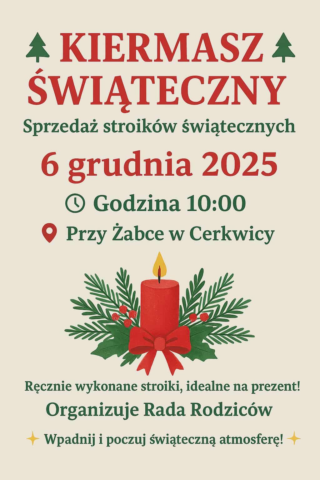 Kiermasz w Cerkwicy odbędzie się w sobotę, 6 grudnia, o godzinie 10:00 przy sklepie Żabka w Cerkwicy. Na miejscu będzie można zakupić ręcznie wykonane stroiki. Organizatorem jest Rada Rodziców Szkoły Podstawowej w Cerkwicy.