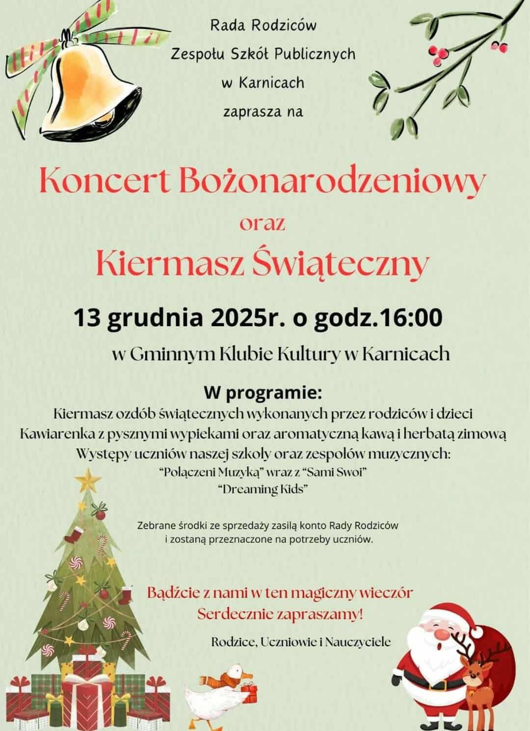 Rada Rodziców Zespołu Szkół Publicznych w Karnicach zaprasza na koncert bożonarodzeniowy i kiermasz świąteczny. Wydarzenie odbędzie się w przyszłą sobotę, 13 grudnia, w Gminnym Klubie Kultury. Z kolei już jutro przy sklepie Żabka w Cerkwicy odbędzie się kiermasz organizowany przez Radę Rodziców tamtejszej Szkoły Podstawowej.
