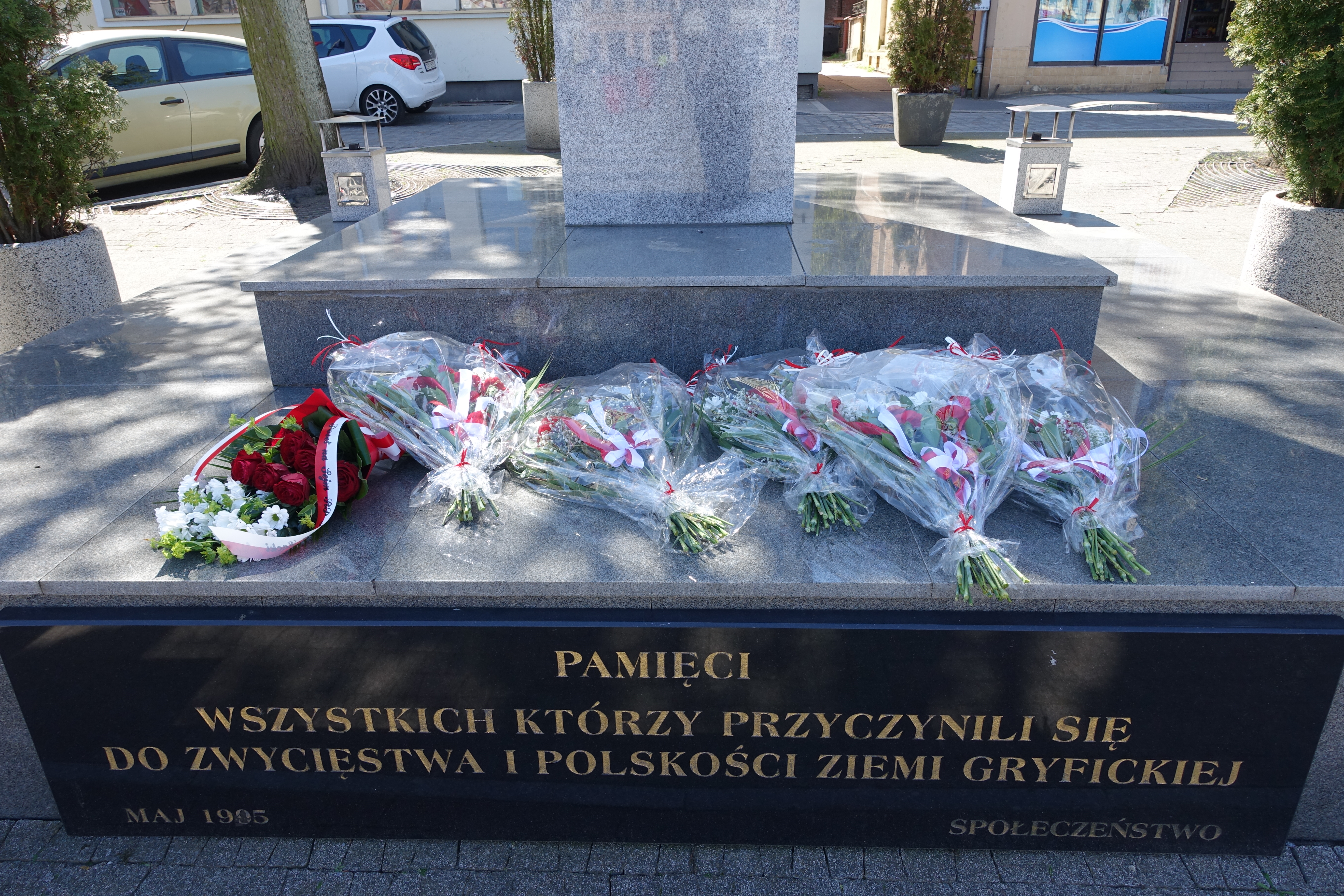 O godzinie 12:00 pod pomnikiem na Placu Zwycięstwa w Gryficach złożono kwiaty ku pamięci poległym żołnierzom.