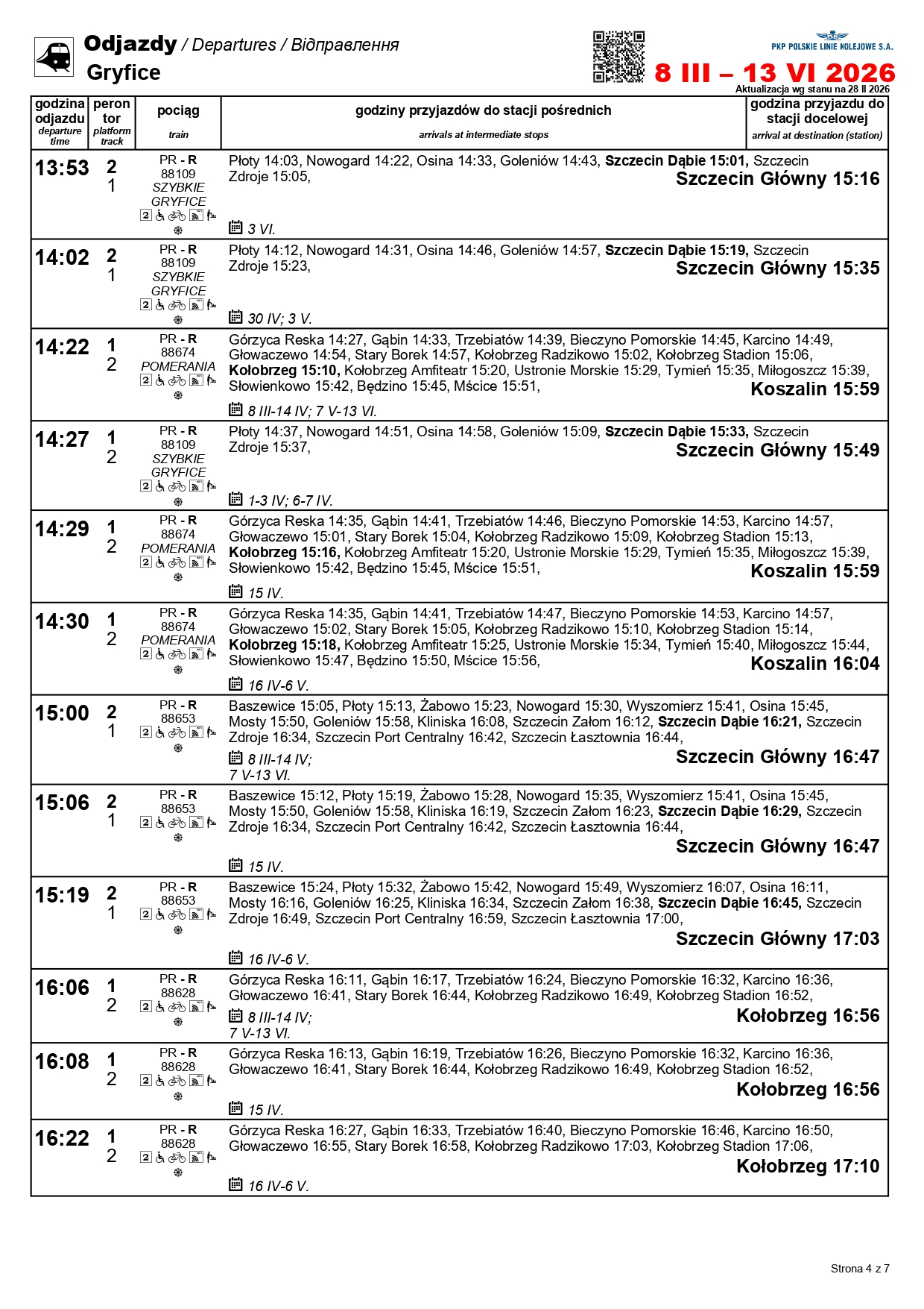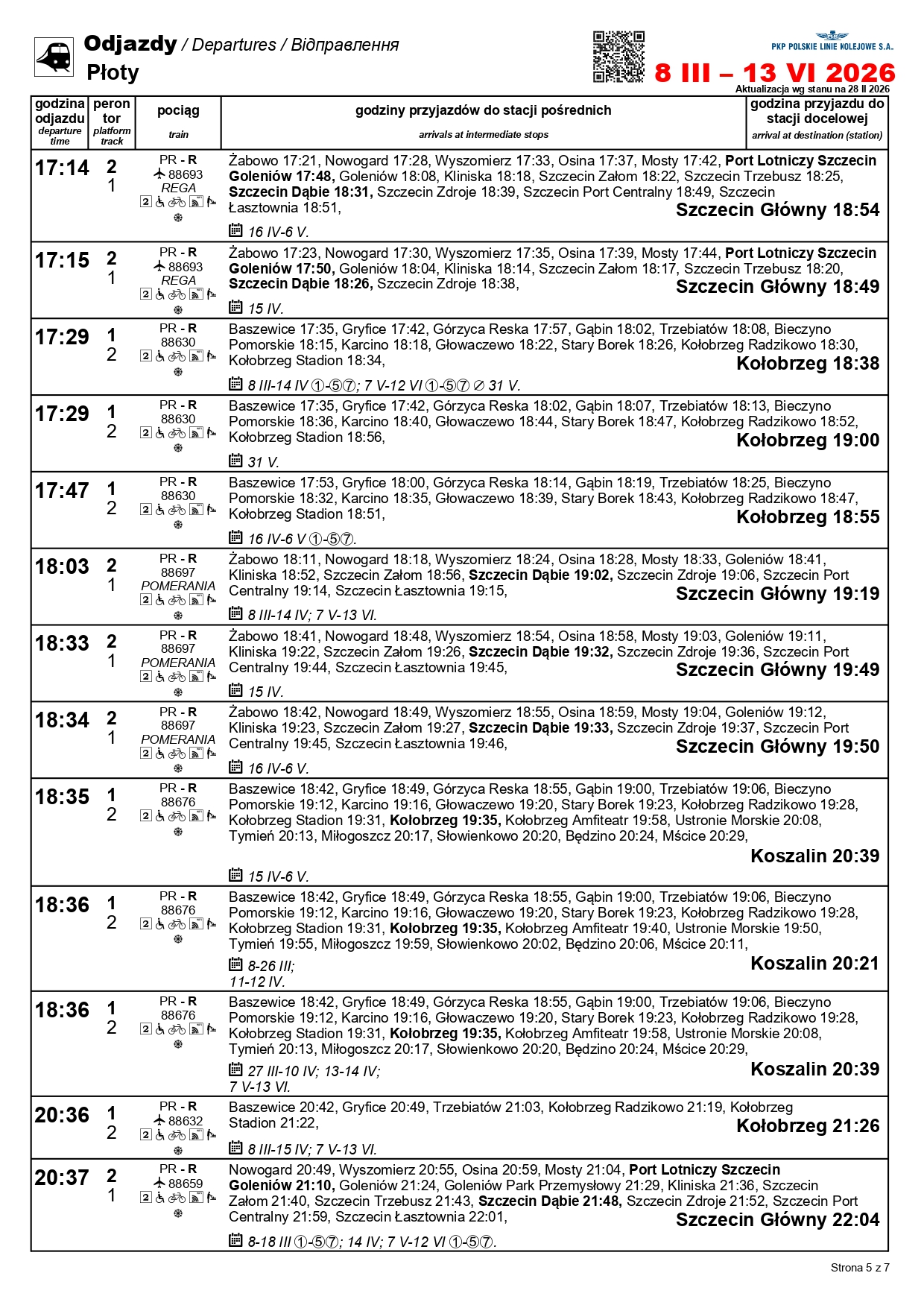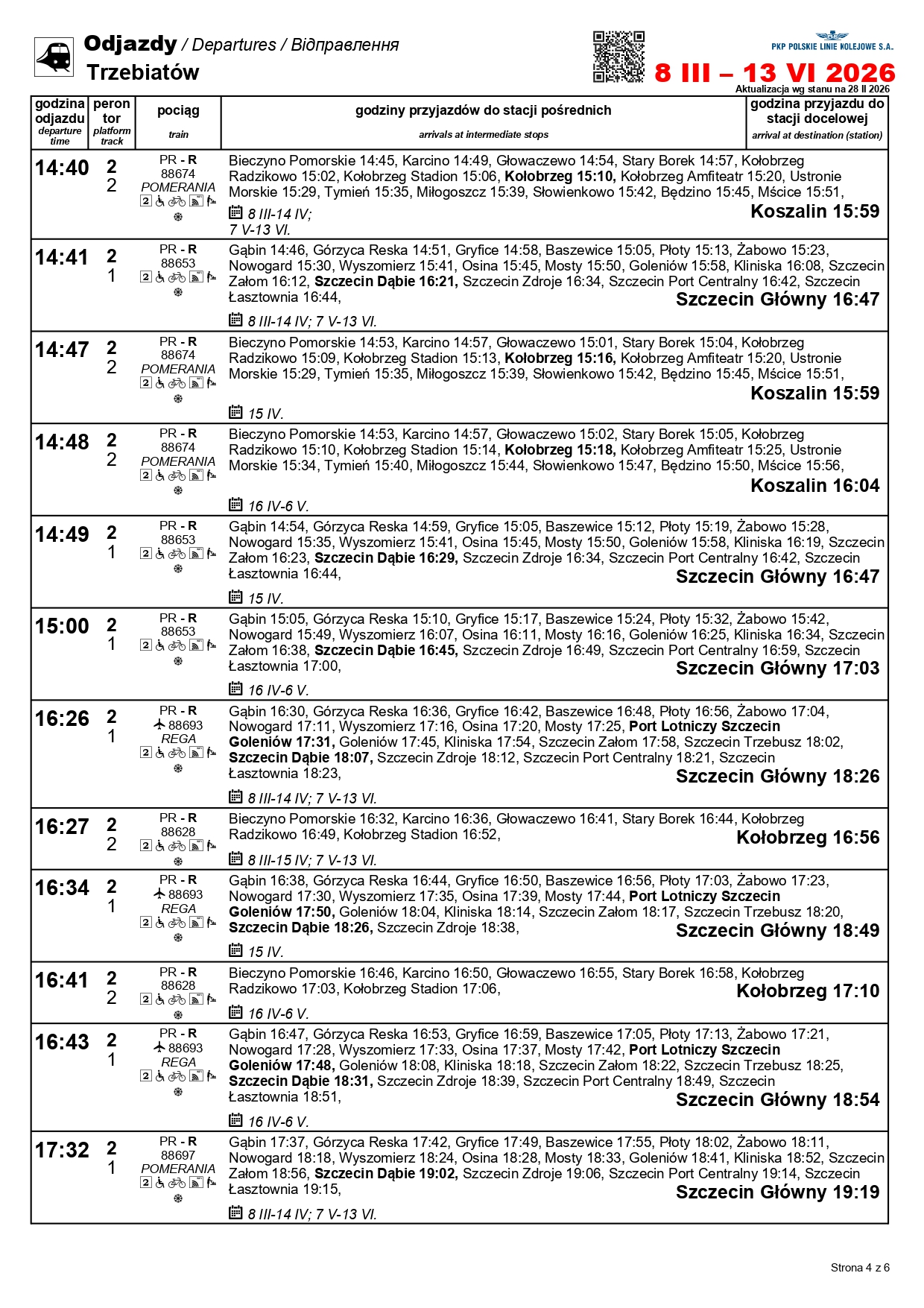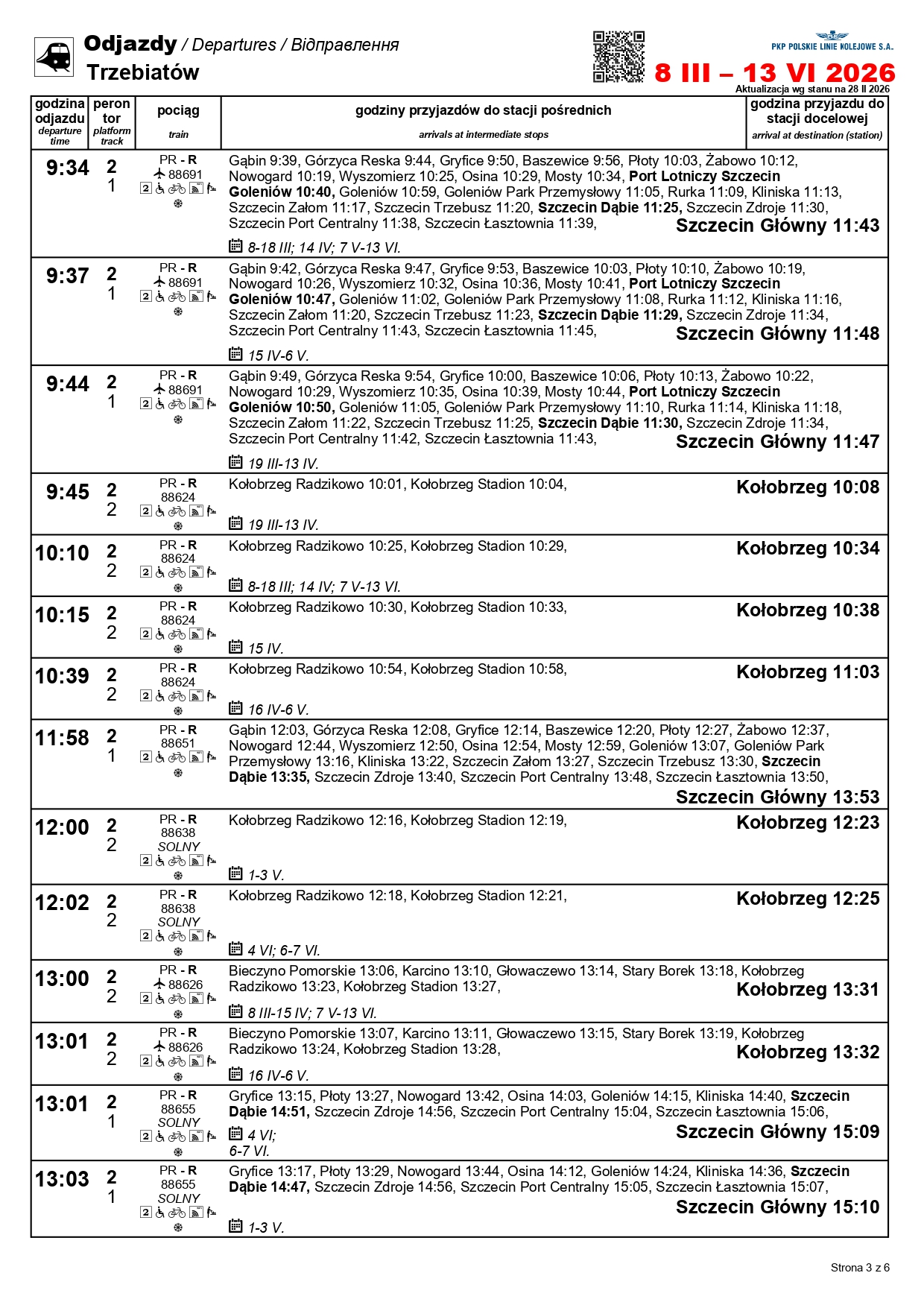Nowością będzie para pociągów w relacji Szczecin Główny–Kołobrzeg. „Solny” będzie kursować między 1 a 3 maja oraz 4 i 6-7 czerwca. Skład wyruszy ze Szczecina o godz. 10:11, a z Kołobrzegu o godz. 12:31. Uzupełnieniem dla oferty na tej trasie będzie para przyspieszonych pociągów w relacji Szczecin Główny–Gryfice. Podróżni skorzystają z nich 1-3, 6-7 i 30 kwietnia, a także 3 maja i 3 czerwca.