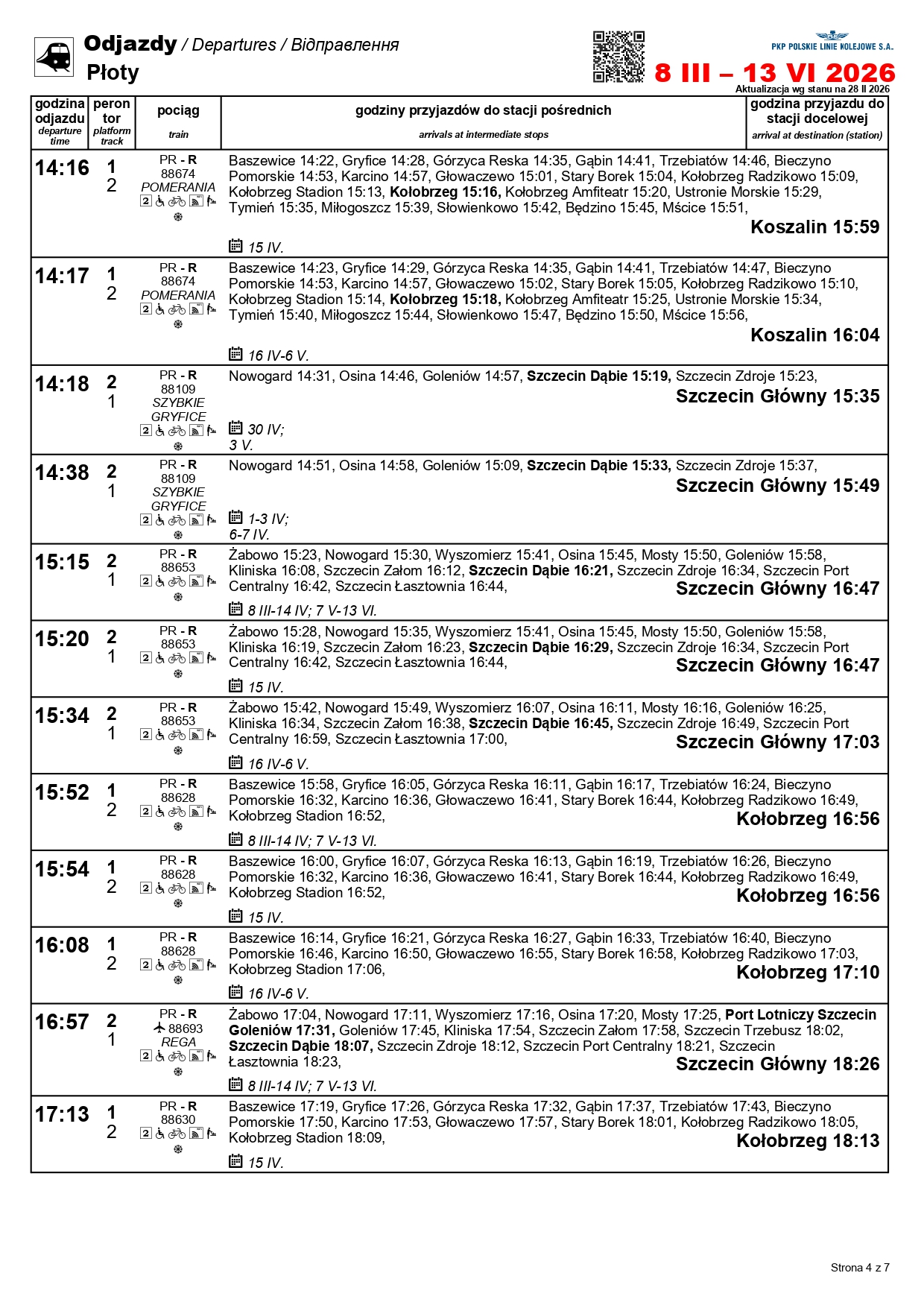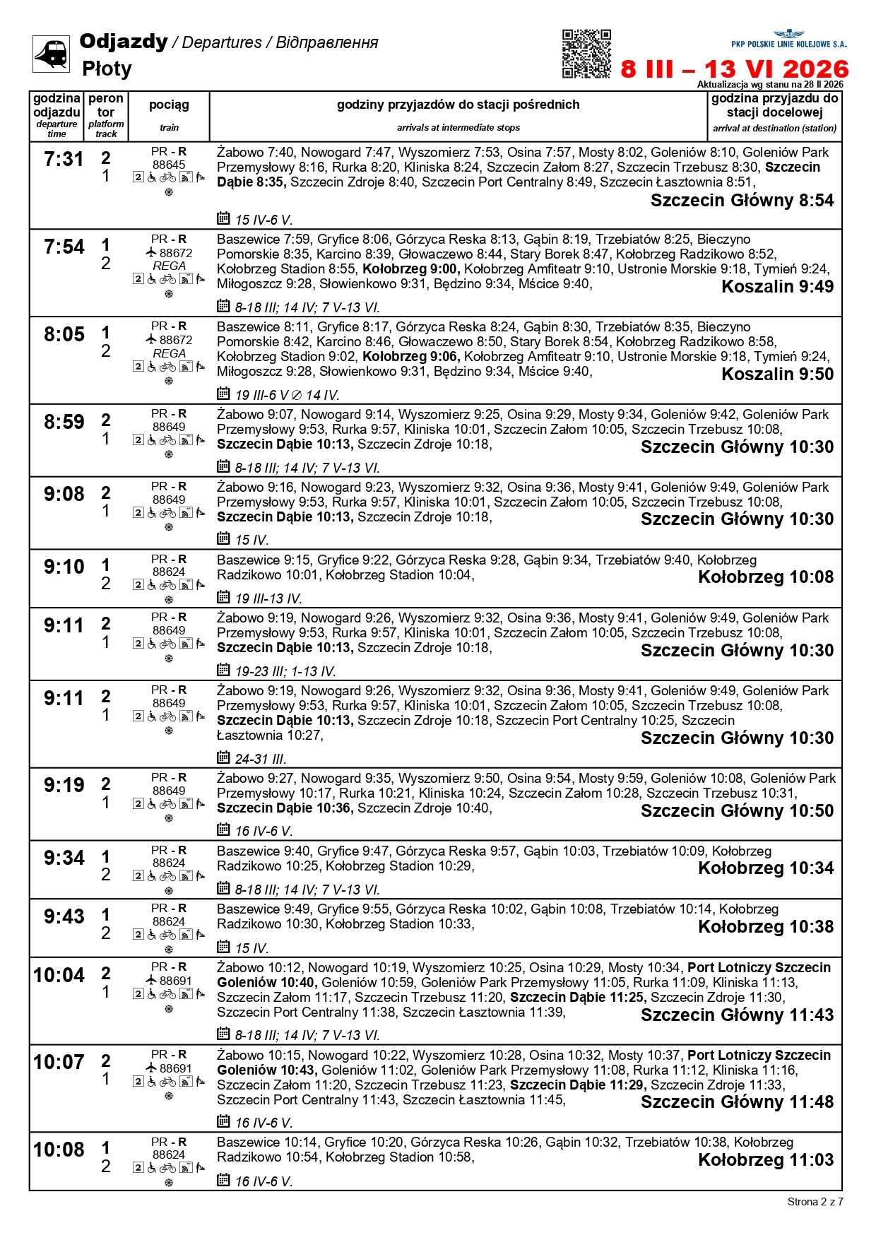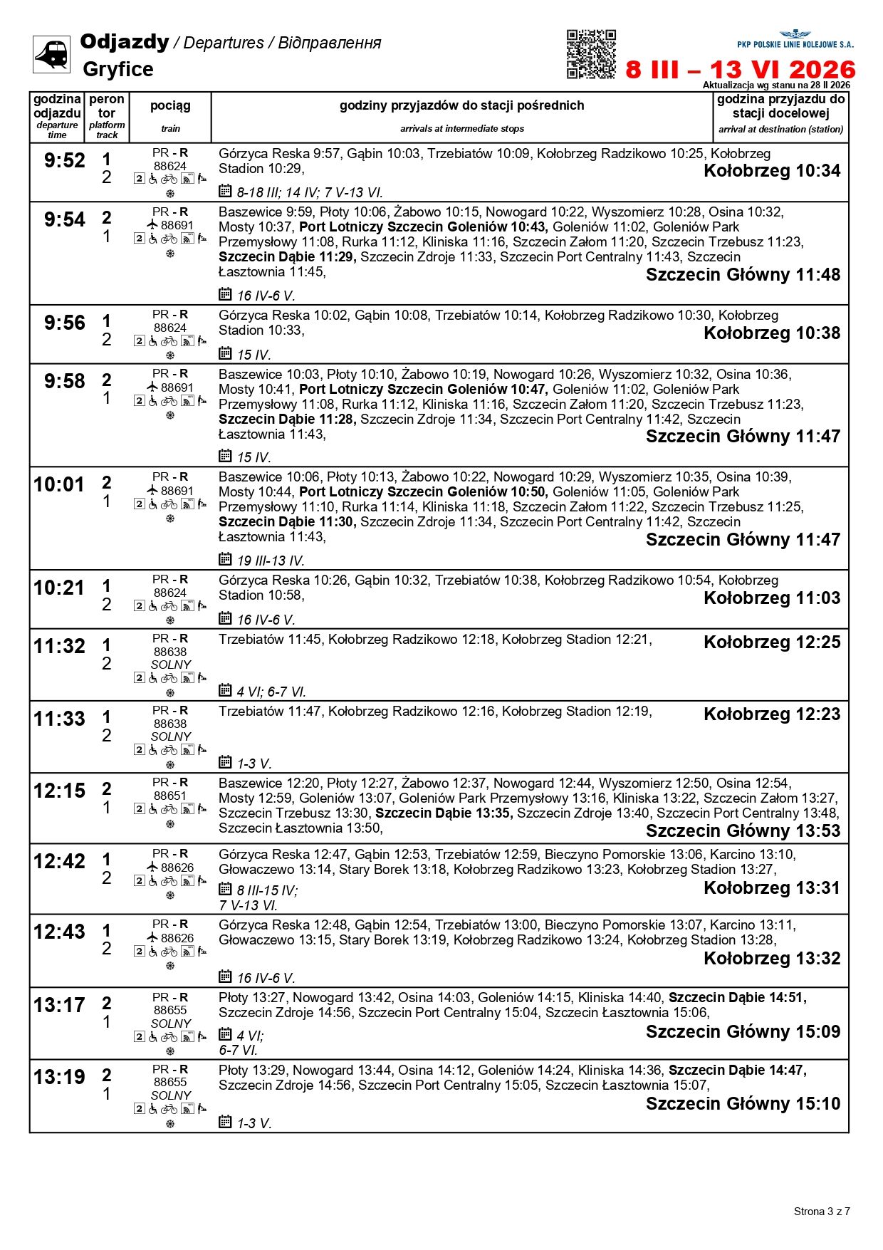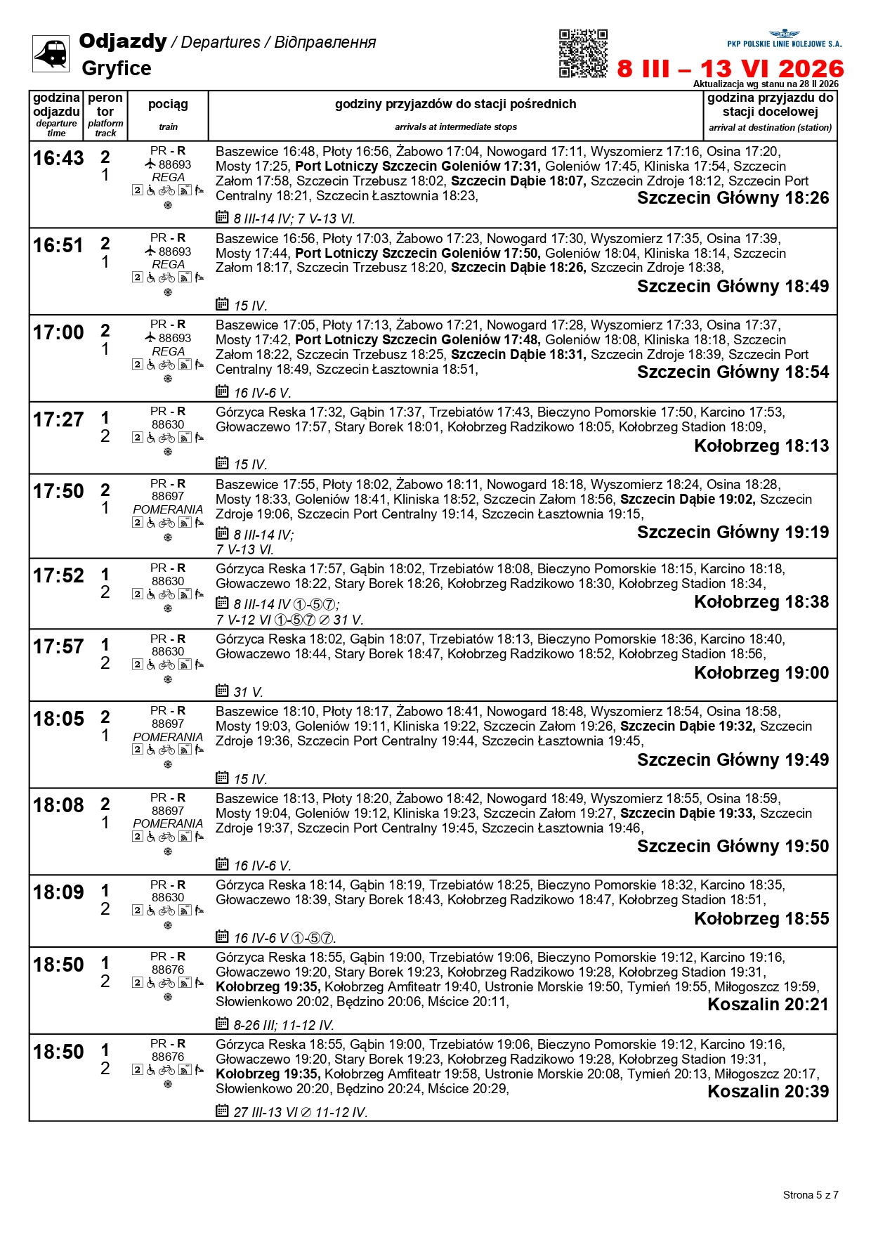 Nowością będzie para pociągów w relacji Szczecin Główny–Kołobrzeg. „Solny” będzie kursować między 1 a 3 maja oraz 4 i 6-7 czerwca. Skład wyruszy ze Szczecina o godz. 10:11, a z Kołobrzegu o godz. 12:31. Uzupełnieniem dla oferty na tej trasie będzie para przyspieszonych pociągów w relacji Szczecin Główny–Gryfice. Podróżni skorzystają z nich 1-3, 6-7 i 30 kwietnia, a także 3 maja i 3 czerwca.