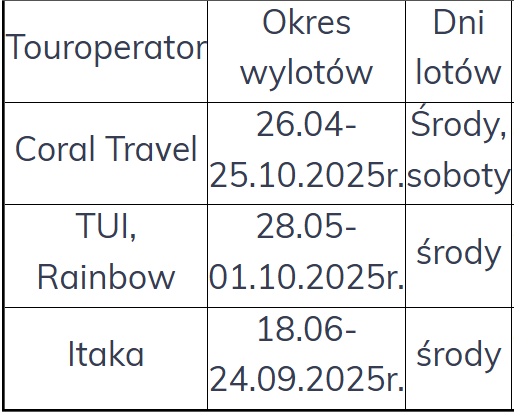 Wyloty z touroperatorem Coral Travel realizowane będą aż do końca października 2025 roku – w każdą środę oraz sobotę pozwalając na konfigurację 3, 4, 7, 10, 11 lub 14-dniowych wypoczynków.
