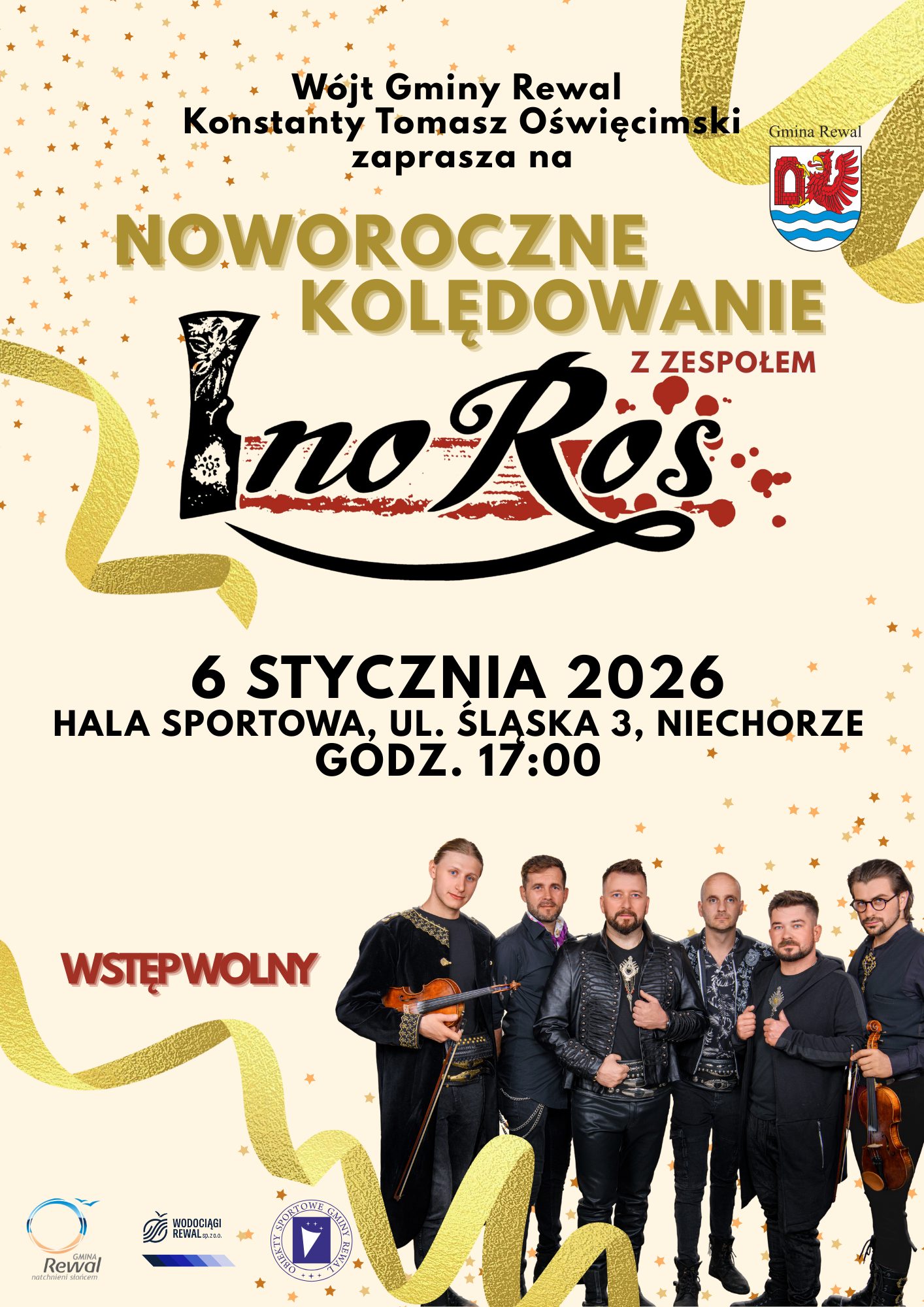 Wójt Gminy Rewal Konstanty Tomasz Oświęcimski serdecznie zaprasza mieszkańców oraz gości na Noworoczne Kolędowanie z zespołem InoRos.